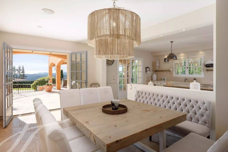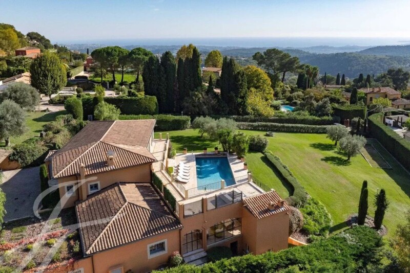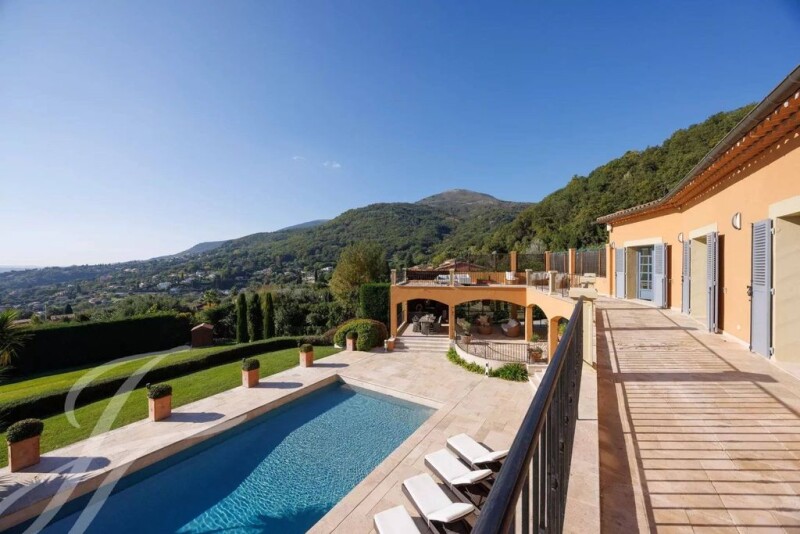 PRICE DROP. Situated in the residential heights of Vence, in the heart of a peaceful neighborhood at the end of a cul-de-sac, this exceptional estate boasts a rare combination of beautiful landscaped grounds of over 4,000 m², with two unique, wide remaining plots, making the entire garden usable, and panoramic views all the way to the sea and the Esterel mountains. This elegant 430 m² home with heated swimming pool embodies comfort and refinement. The wrought-iron gate opens and a paved path lined with greenery leads to the parking area and two-car carport at the rear of the house. The front door, protected by its porch, invites us to enter. From the entrance hall, the view of the sea and the generous volumes of the house are revealed. The spacious, light-filled double living room features a sitting room with fireplace, a reading room and a wine cellar. The dining room is adjacent to the kitchen, and has a very convivial layout. The vast kitchen with central island forms the heart of the villa, ideally situated between the interior reception rooms and the large, fully-covered summer living/dining room. Five magnificent Suites, each with en-suite bathroom/shower and walk-in closet, offer all the comfort needed to welcome family and friends in an unforgettable setting. A gym completes this sumptuous villa. Cellar, laundry room, utility room. The well-maintained exteriors can be used all year round, thanks to the magnificent covered terrace with summer kitchen in front of the house. The huge flat garden area will delight the youngest visitors, making for endless playtime! A visit is a must! État des risques et pollution: réalisé (null).