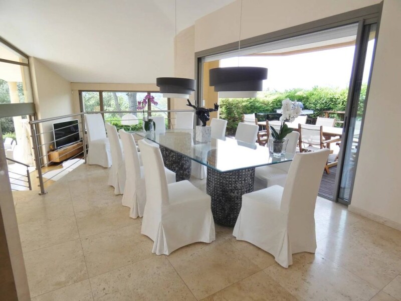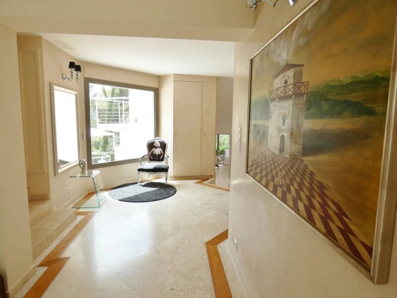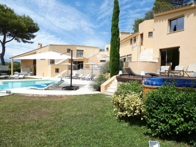 - Magnificent villa of 450 sqm on a beautiful, landscaped land or 5 200 sqm, located in one of the most exclusive residential sites of Mougins, Hameau du Guillet, chemin Pablo Picasso, 3 min from the Mougins Golf Country Club, full open view to Est-South-West and to Mougins Vieux Village. Large living room/dining room of 170 sqm, six large bedrooms ‘suites with 6 bathrooms, one of which is a suite with independent entrance, consisting of two double bedrooms and 1 bathroom. Each room equipped with independent air conditioning, satellite TV, WiFi, private terrace overlooking the park or swimming pool. - Architectural swimming pool, with side waterfalls - - Lighted water wall behind the swimming pool - Main living room on three levels, with double indoor and outdoor dining room. - 6 outside Terraces and patios - 6-seater outdoor Jacuzzi, Barbecue and Ofyr, Ping-pong, - Mediterranean park > 5,000 m2 with health course Garage de 50 m2 et 7 parkings. Available Service staff, lodging in a separate apartment adjacent to the villa, for laundry service and linen change, daily cleaning, room menage, necessary maintenance and assistance for swimming pool systems, jacuzzi, WiFi, video surveillance, park maintenance, etc. Sale price inbcluding furniture and new renovations.