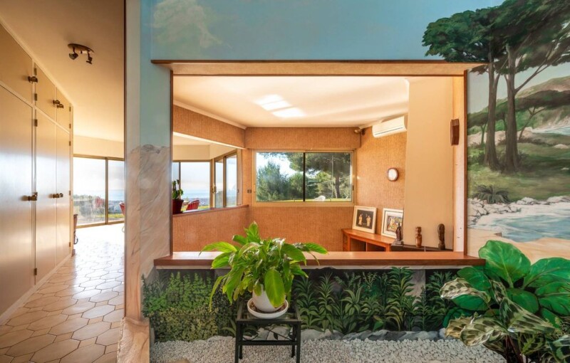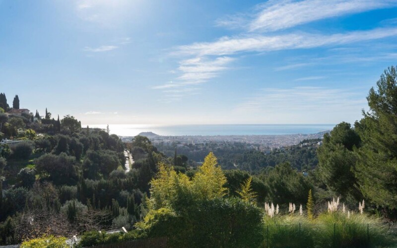 In the prestigious Gairaut district, this sculptural villa, designed in 1980 by architect Patrick Cavenel, overlooks the city and offers a breathtaking panorama of the Baie des Anges. Its bold design, inspired by the postmodern movement, combines geometric shapes and dynamic volumes to create a true architectural masterpiece. Set on a south-facing 2,150 m² plot, the villa spans 286 m² of floor space (193 m² under the Carrez law), all on one level. The double-height entrance, bathed in natural light from its skylights, leads to a spacious reception area. This includes a dining room, a living room with a fireplace set in a conversation pit, a winter garden, and a fully equipped kitchen with a central island, pizza oven, and pantry. Expansive glass doors create a seamless connection with the terraces and landscaped garden. The night area, accessible via a hallway, features a 52 m² master suite with a dressing room and a bathroom adorned with stained glass windows by Alain Peinado. Two additional bedrooms, each with its own bathroom, open onto the garden. A staircase leads to the 86 m² basement, which includes a triple garage, two workshops, a bathroom, and storage space. Vehicle access is optimized with ample outdoor parking and a ramp leading directly to the garage. The landscaped garden, which can accommodate a swimming pool, includes a pétanque court and a stone outbuilding converted into a workshop. Located in a private, secure, and secluded residence, the property offers direct access to the Gairaut canal and is just 12 minutes from downtown Nice. This rare postmodern villa will appeal to architecture and design enthusiasts seeking a unique property that offers space, comfort, and an exceptional panorama. This exclusive property is presented by Côte d’Azur Sotheby’s International Realty in Nice.
