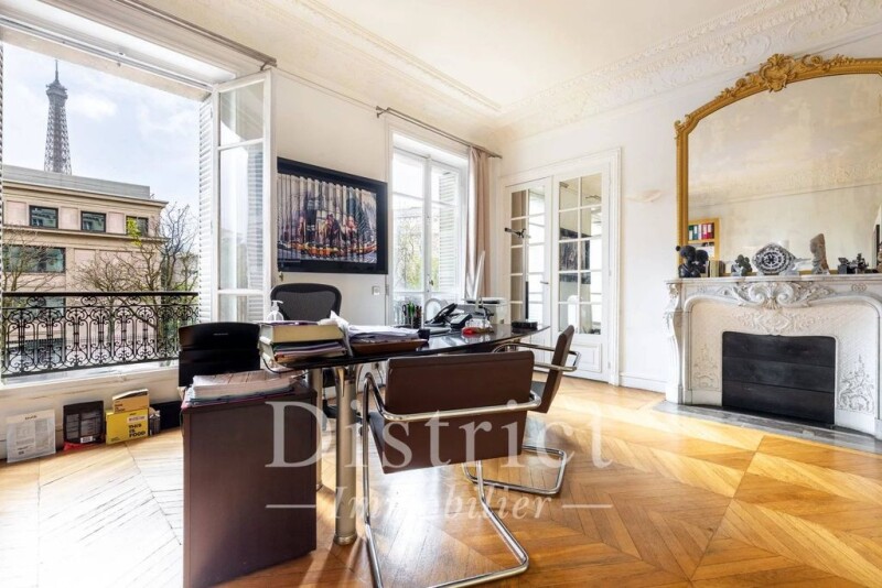 District Immobilier offers you exclusive access to these 175m² premises in perfect condition, just a stone's throw from the Jardins du Trocadéro, Place d'Iéna and the Golden Triangle. Located on the 1st floor elevator of a magnificent Haussmann building, perfectly maintained and secured (Digicode, intercom and gadien at residence), they benefit from 3.20m high ceilings, the cachet of apartments from this era and unobstructed views of the Eiffel Tower. Excellent layout with a waiting room, 5 rooms (4 overlooking the Eiffel Tower), a kitchenette and 2 wc. The property retains its old Parisian charm with parquet flooring, moldings and fireplace. It is currently used by doctors and will be sold occupied for 5 years at a rent of €10,000. Ideal for professional or residential use. Two cellars complete this exceptional property. Contact Madame Starostina on 06 62 98 23 30.