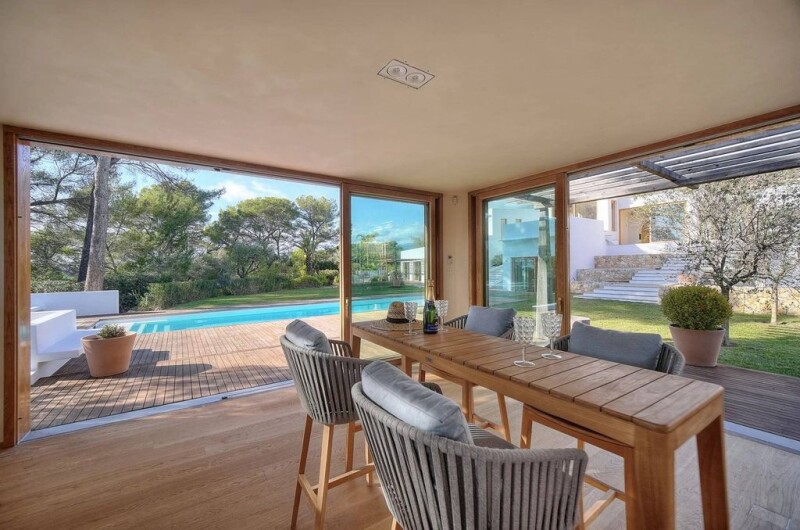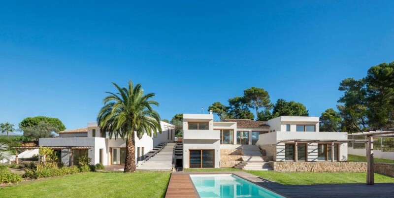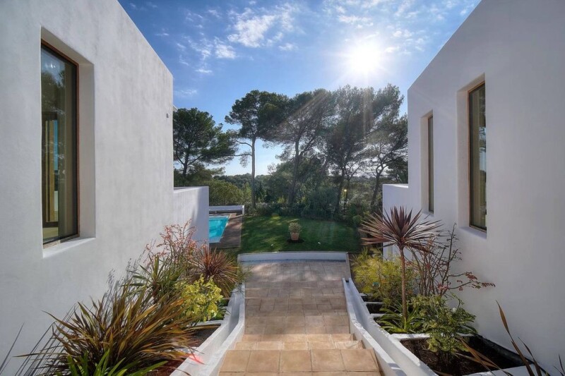 Unique contemporary villa for sale in Mougins in a private domain. This exceptional estate offers luxurious living in the heart of the French Riviera countryside within a stone's throw of the coast, just a couple minutes drive from the historic vieux village of Mougins and walking distance to the international school. Recently redesigned and fully refit with custom high end artisanal materials. Tennis, pool and boules court in the domain. The property offers nearly 900m2 of interior living space, consisting of 7 ensuite bedrooms and a separate caretaker/guardian's apartment on 3,600 m2 of south facing land with open views of the surrounding countryside and a glimpse of the old village. In a style reminiscent of the southwest United States and fusions with Provence, natural elements are incorporated into the home's design including the highest quality German parquet floors, artisanal cabinetry as well as handmade kitchen and bathroom fittings from New York and magnificent interior masonry finished in white clay. High-spec home appliances in the various kitchen areas in both open plan living areas, poolside summer kitchen and apartment as well as in the two barbecue areas. All windows and frames have been custom made for the property with double glazed security glass mounted on steel frames with a wood veneer coverings integrating with the harmonious styling of white clay, glass and wood finishes throughout. The bedrooms offer spacious suites with built in closets throughout and dressing rooms in the 2 master suites. There are 2 very spacious rooms which are perfectly suited for a home gym and yoga studio as well as many other options depending on the future owner's vision. Additionally there are 2 offices or library spaces, a home cinema room and various storage spaces and tech rooms. Outdoors the home opens onto various terraces and patio areas leading out to the garden and swimming pool area with paths leading to the boules court and around the rest of the property. A spacious open plan summer living and dining room with full kitchen make up the pool house with a room of the same size with kitchenette and bathroom below opening onto the lowest part of the garden while being fully accessible by vehicle. Two main gates open from the domain's private lane and provide plenty of open air and covered parking as well as two large linear garages with parquet floors for showcasing a future owner's collection of cars or simply providing additional living space if preferred. Contact us today to find out more.
