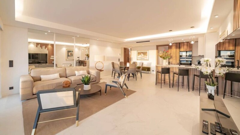 Outstanding 100 m2 3 bedroom flat located on a high floor of a sought-after residence in Basse Californie with independent 1-bedroom flat. It benefits from a panoramic view over the bay of Cannes and the Lerins islands. The flat is composed of a large living room with open kitchen opening onto the south-west facing terrace, 3 bedrooms en suite. Large terrace of 27 m2 offering a superb sea view. A parking space and a cellar complete this beautiful flat entirely renovated with luxurious fittings. A guest flat of 48 m2 on the ground-floor is also included , comprising a living room with open-plan kitchen and a bedroom with en suite bathroom. This flat has a loggia with garden and sea views. The residence has a concierge service and an indoor swimming pool. Contact us today to find out more.