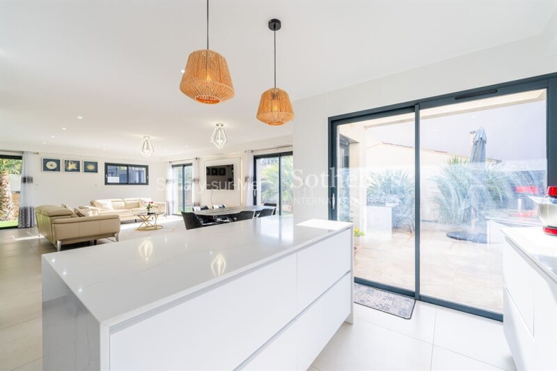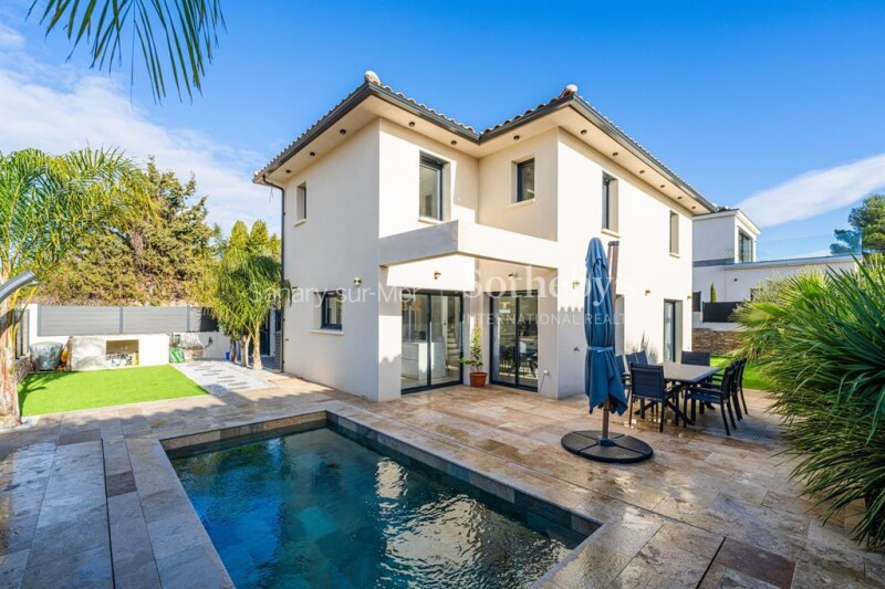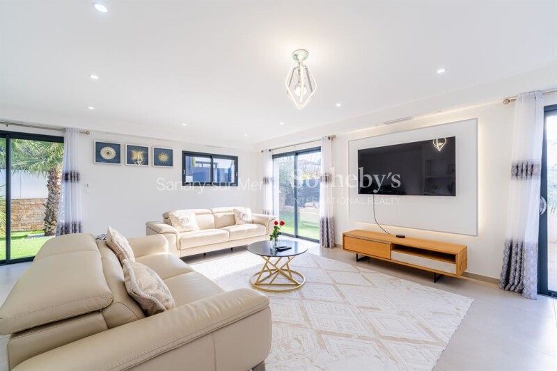 For sale in Sanary-sur-Mer, a contemporary house with three bedrooms, a garden, and a pool. Located just 10 minutes on foot from the town center and beaches, this stunning modern home offers 121 sqm of recent construction. Bright and nestled in a peaceful environment, it enjoys an ideal location close to local shops. The spacious and welcoming living area features a large, light-filled lounge and dining room, along with a fully equipped open-plan kitchen. The house includes three comfortable bedrooms, with the option to create a fourth to suit your needs. Outside, the charming south-facing garden is home to a heated pool, perfect for enjoying sunny days. This property is a true haven of peace, combining modernity, comfort, and convenience.