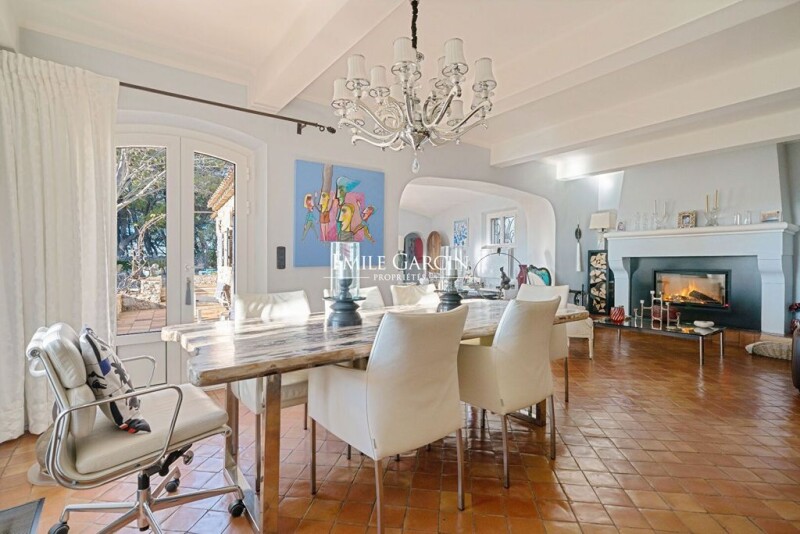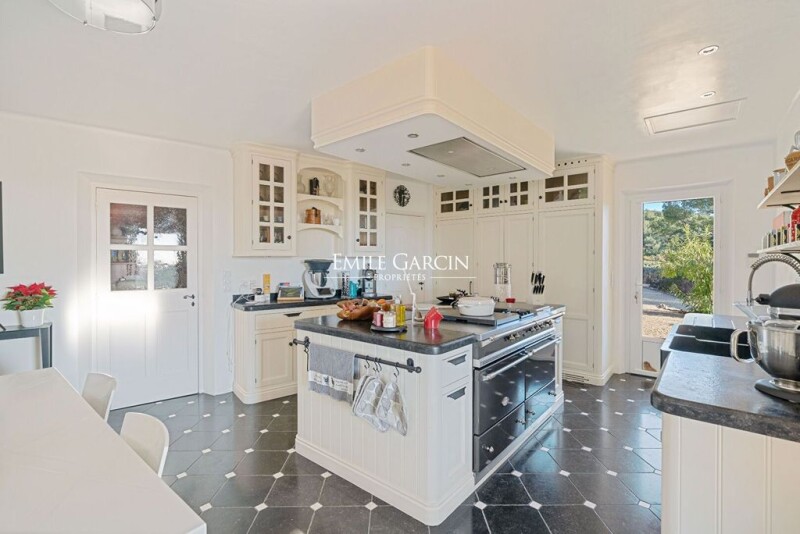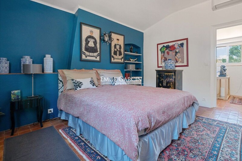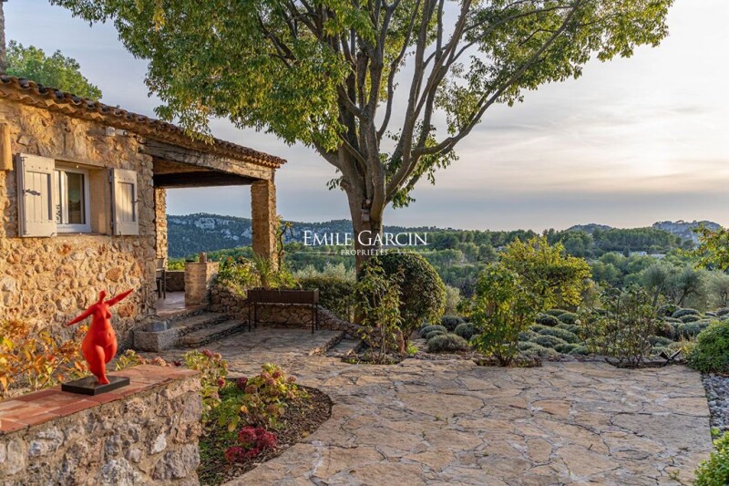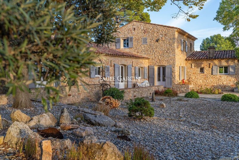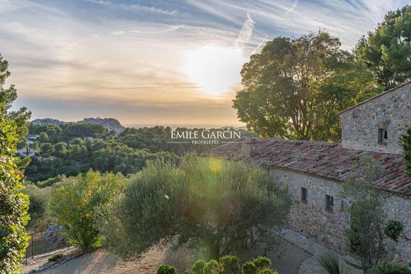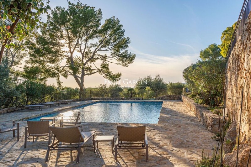 Magnificent 2-hectare property presenting a stone farmhouse of 230 sq.m. The ground floor comprises a double living room with fireplace, a dining room with adjoining kitchen backing onto a covered terrace with panoramic views, a master suite with bathroom and dressing room, and a bedroom with bathroom. Upstairs, you will find two additional bedrooms with bathrooms. The refined grounds feature 300 feet of olive trees among a majestic mixture of Mediterranean trees. Set back from the house, the 15.5 x 7m swimming pool with its pool house and magnificent wrought-iron pergola are a veritable invitation of rest and relaxation. Additional facilities include a 105-sq.m garage, a triple carport and a wine cellar.