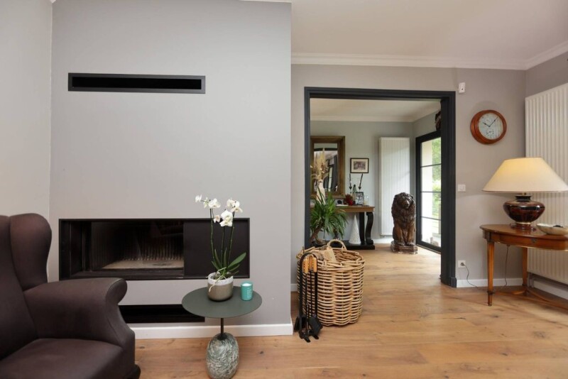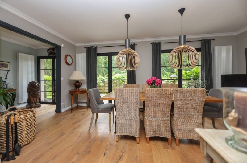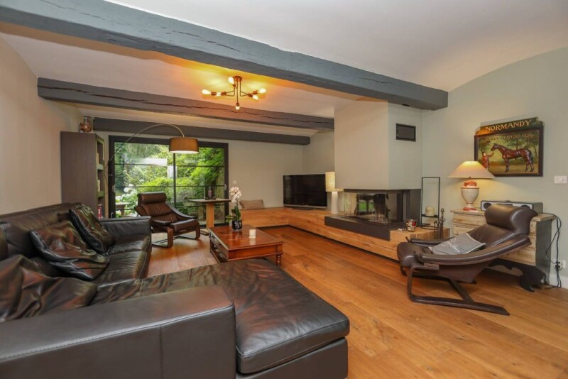 At the end of a long private driveway stands this magnificent contemporary villa, with outdoor pool, overlooking a superb wooded and landscaped plot of over 3,000 m2. It spans 3 levels and 250 m². A vast entrance hall leads to the living and sleeping areas on the first level: living/dining room with fireplace, separate kitchen, utility room, study, shower room and master suite with en suite bathroom. The reception rooms and bedroom are open-plan, with superb views over the countryside and a south-facing terrace. The lower level features a large lounge with a fireplace, 2 large bedrooms overlooking the parklands, a shower room and a linen room. The top floor has 2 large bedrooms and a shower room for the children. The property is fitted to a very high standard, with door and window frames, solid parquet flooring and recent renovations, including the roof and sparrow covers, carried out less than 2 years ago.