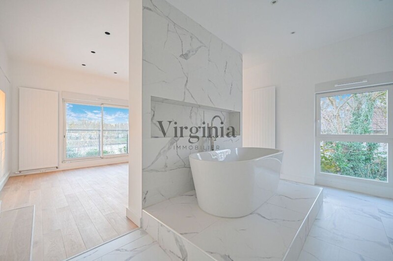 The Virginia Immobilier agency is pleased to present this sublime prestigious residence ideally located in a private cul-de-sac facing the Marne. You will be seduced by its spaces, its volumes and its services! The house is composed, on the ground floor, of an entrance with dressing room, a separate toilet, a large triple exposure dining room with open kitchen and access to a terrace of approximately 80m² facing the Marne, a large living room communicating with the indoor swimming pool on the same level as the garden and a bathroom with a huge Italian shower. Upstairs, 3 bedrooms including a master suite which consists of a bathroom, a dressing room and a toilet, all giving an exceptional view of the Marne, a bathroom with toilet, a large space leaving the possibility of installing an office and possibility of creating a 4th bedroom. In the semi-buried basement, a boiler room, a laundry room, a machine room for the swimming pool, a large garage and a completely independent bedroom with its shower room, toilet and kitchenette. The house has been completely renovated with a ten-year guarantee in progress. For more information, do not hesitate to contact us.