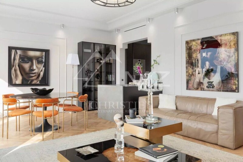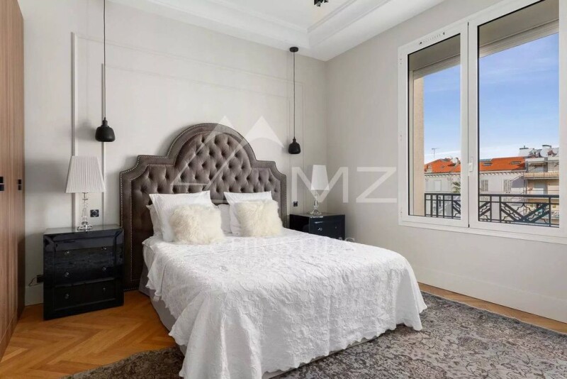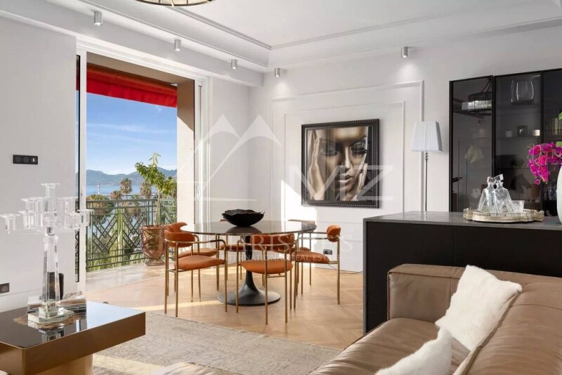 In Cannes, overlooking the gardens of the Grand-Hôtel and the Croisette, magnificent middle-class flat with spacious rooms and high ceilings. The flat is ideally distributed and has been completely renovated. Entrance hall, large living room opening onto balconies, fully-equipped semi-open-plan kitchen, 3 en suite bedrooms with en suite bathrooms/showers, laundry room, large top-of-the-range dressing room. Large cellar and communal parking. État des risques et pollution: réalisé (null).