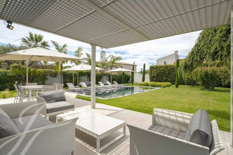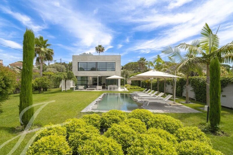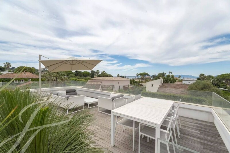 Beautiful new contemporary villa completed in summer 2020, offering 320 sqm living area surrounded with 940 sqm grounds and enjoying nice sea views (the Bay of Juan les Pins and the Iles de Lerins) from its roof top terrace/solarium. Ground-floor : The main entrance gives access to a hall with to the left the kitchen; opposite a staircase to the first floor, a corridor with to the right a WC and to the left an ensuite bedroom; to the right a large open space including the dining room and the living room. Doors slide fully open to garden (indoor outdoor flow) Underground/Basement floor : Large wine room, large TV room, room with sink/washer dryer plus utility room First-floor : Landing, a bathroom and two bedrooms on both sides, to the right a corridor (towards the West) with to the right a staircase to the roof terrace and opposite two ensuite bedrooms. Roof terrace : The roof terrace is accessible when the retractable roof ceiling is opened. Lounge seating and parasols on the terrace Swimming pool Two cars parking Equipment : alarm system (house + garden) - video system - cameras to view outside the house - automatic gates - Air conditioning / heating system (individual controls for each room).
