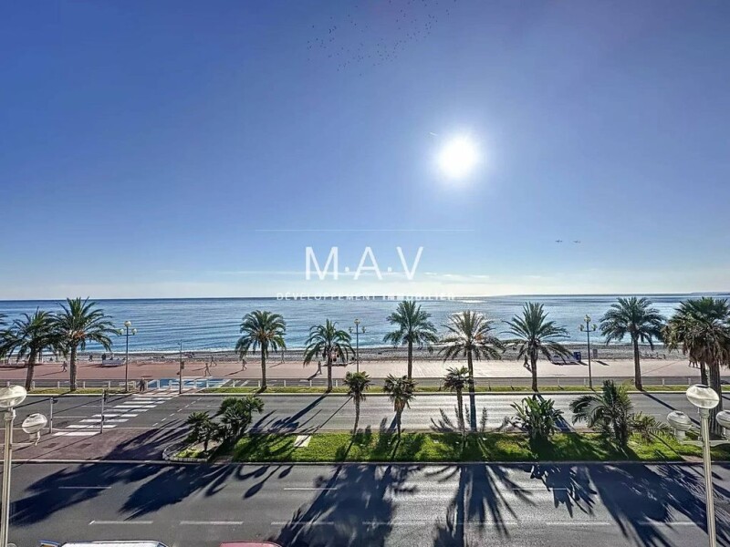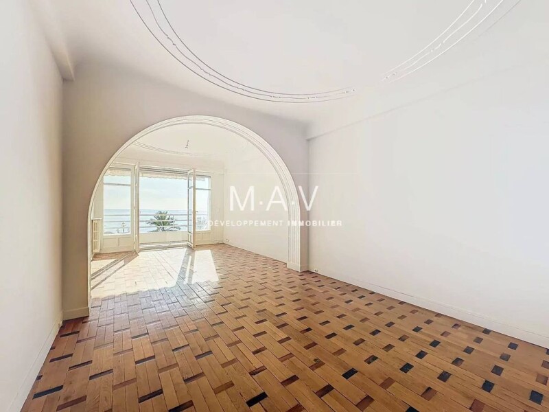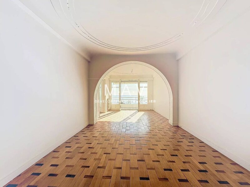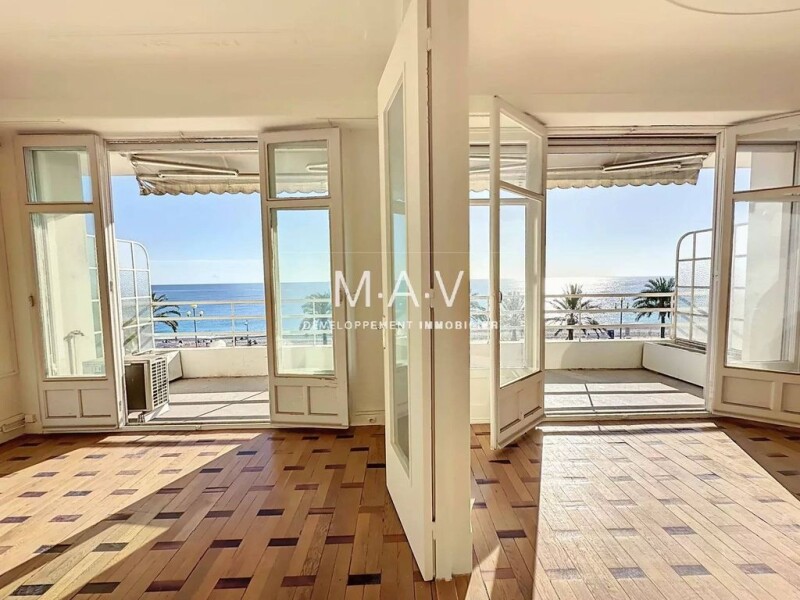 Located on the famous Promenade des Anglais, a winter resort for the English since the 19th century, facing the Baie des Anges, near the Negresco hotel, in a luxury building with concierge, labeled "20th century heritage" inspired by luxury liners with its balustrades and rounded glass corners. Superb 3-room apartment of 118 m2 to renovate, on the 3rd floor, crossing, offering a breathtaking sea view, benefiting from a 14 m2 terrace and optimal sunshine due to its southern exposure, beautiful ceiling height of 3m10. It consists of an entrance, spacious double living room of 35 m2, independent kitchen with entrance and service elevator, a master bedroom with sea view and its adjoining bathroom with toilet, second bedroom with shower room / wc, dressing room. A cellar completes the property. Possibility to purchase a garage in addition to a dimension of 2.55 width / 4.92 length. Fees payable by the seller. Presentation file with video available on request. État des risques et pollution: réalisé (null).