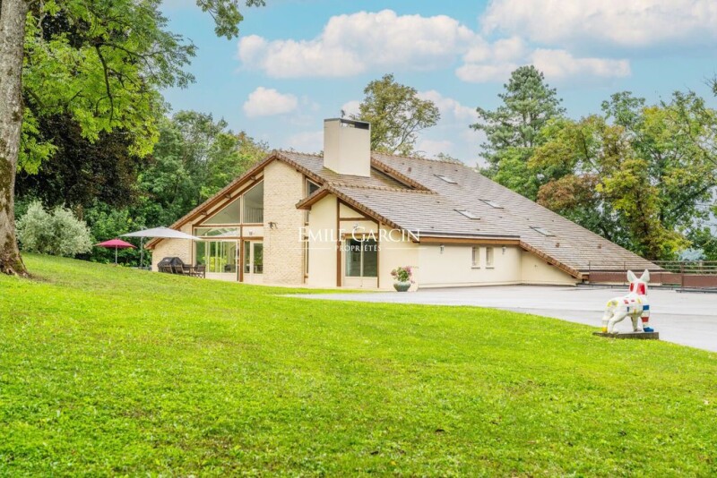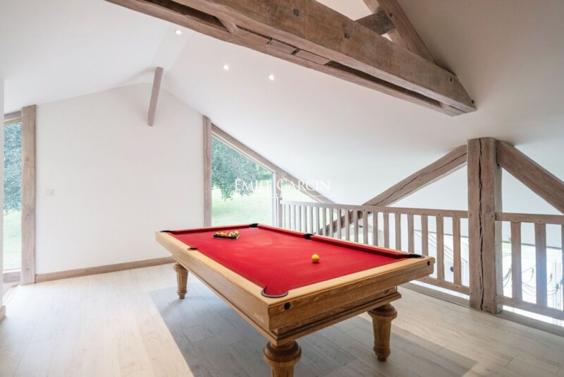 This magnificent property is tucked away in an exceptional countryside setting in the Vexin region, between Gisors and Chaumont. The three-story house has been recently renovated. On the ground floor, there is a large living/dining room, a kitchen, a home office, a master suite, an ensuite bedroom, and a home gym. Upstairs, you will find a large mezzanine followed by two bedrooms, each with its own shower room. On the garden level, there is a home cinema, an ensuite bedroom, a workshop, a boiler room and a large garage. It sits on over 67 hectares of hilly grounds consisting mainly of a deciduous forest and some meadows, beautiful land for hunting or enjoying nature. The outdoor spaces also feature a heated swimming pool and a large shed.
