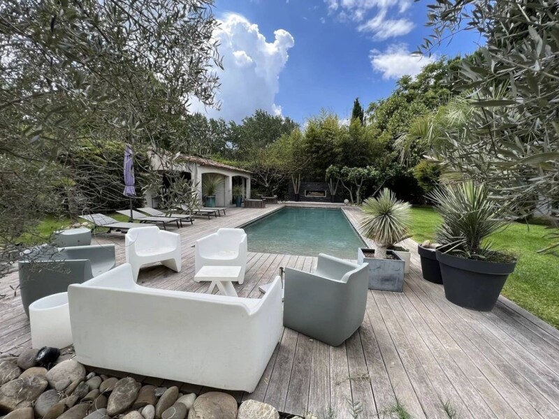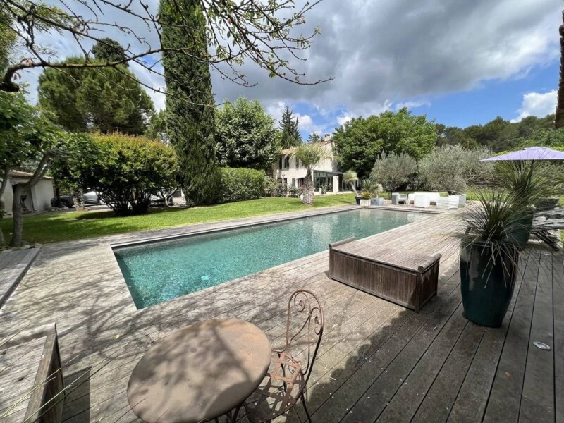Large family house 10 minutes from the bustling city of Aix en Provence, close to a lovely Provencal village and all amenities, located in a privileged countryside setting, old former hunting lodge completely renovated with quality materials. In perfect harmony with its environment, quiet, privacy, it's located in the heart of a superb fenced, landscaped garden 2500 m2 planted with many Mediterranean trees and fruit trees. Nice pool (12 x 4 m) with its teak terraces, pretty pool house with a shaded terrace and a summer kitchen. The main house all in stones : comfortable living room with a pretty style chimney, shaded terrace on the south, superb dining area in a large veranda, small cosy living room to relax, spacious modern furnished kitchen with dining space, storage room / laundry room, 1 bedroom with private shower room, toilet. Upstairs : 1 main comfortable bedroom with private shower room, 2 other bedrooms, dressing room, shower room, toilet. A pretty independent bedroom, adjoining the pool house, with private shower room and toilet. Independent studio with living room, furnished kitchen, shaded terrace, shower room with toilet. Garage, carport, garden shed, vegetable garden, well. Good exposition, the house is really pleasant to live in. In perfect condition, the materials are noble, the dimensions are generous and the volumes harmonious. Tastefully decorated, this quality house full of charm will be a peaceful place for holidays or as a permanent residence.