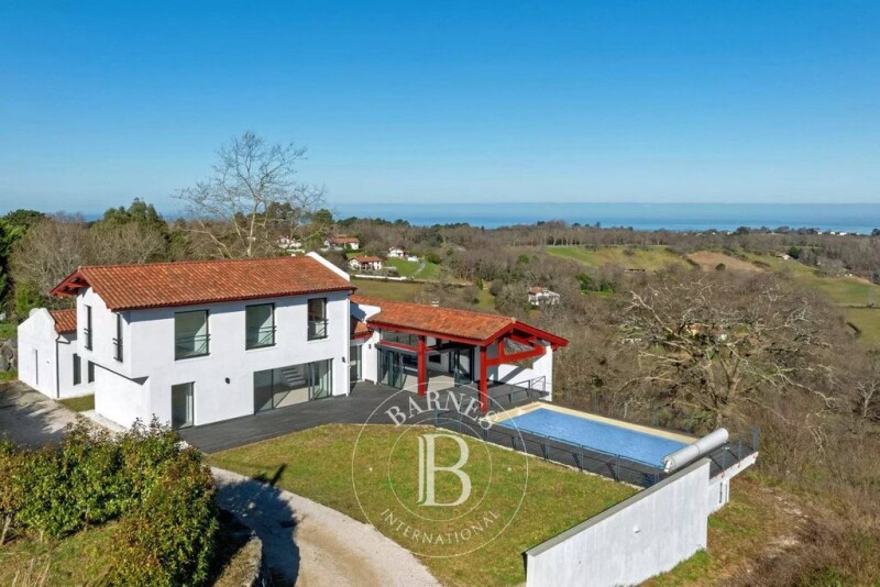 Urrugne, near Saint-Jean-de-Luz, contemporary house offering a dominant view of the basque views. The house also opens onto the bay of Saint-Jean. With a surface area of approximately 240 m² on a plot of 1800 m², this house, completely renovated in 2023, has 6 bedrooms for 5 bathrooms/shower rooms and a large living room with double view opening onto the swimming pool. A beautiful terrace and a flat garden give this property rare qualities.