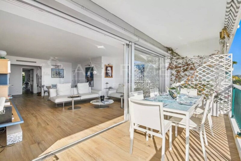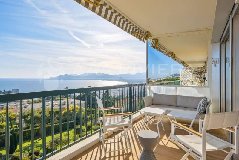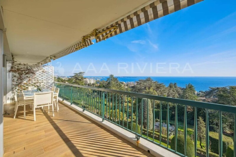 In the heart of a high-end residence, located on the heights of the historic English quarter of La Croix des Gardes, nestled in a 3-hectare park with a swimming pool and tennis court, this spacious apartment on a high floor has been completely renovated in 2021, offering a panoramic view of the sea, the Esterel mountains, and the Bay of Cannes. Bright and airy, it comprises an entrance hall, a living room with large bay windows that open onto a nearly 20 m² dining terrace, providing a rare view of Palm Beach and the Lérins Islands. The two main bedrooms are en suite with shower rooms and spacious dressing areas. The first bedroom faces south with a spectacular sea view, while the second overlooks the hills and gardens. A cabin room with bunk beds provides an additional sleeping area. High-quality materials and elegant renovations are in harmony with the aesthetic codes of the residence. You will find complete amenities: central air conditioning, electric shutters, a caretaker, and most importantly, you will have the pleasure of enjoying the magnificent Italian Renaissance-style garden of 3 hectares, adorned with Mediterranean tree species, a beautiful historic swimming pool, and a tennis court with the omnipresent sea as a backdrop. To complete the offer, there is a garage and two cellars, as well as a studio renovated in 2024 of approximately 21 m², independent of the apartment, which can be used as a service apartment or for rental income. While being in absolute tranquility, you can access the beaches and the city center of Cannes in just a few minutes by car, with Nice airport located 35 minutes away. Condominium charges = €900 per month, including water, heating, air conditioning, caretaker services, and maintenance of the common areas.