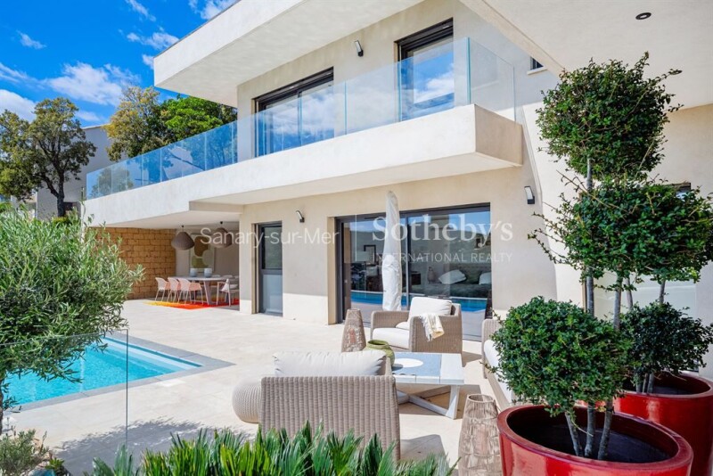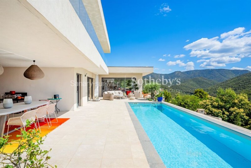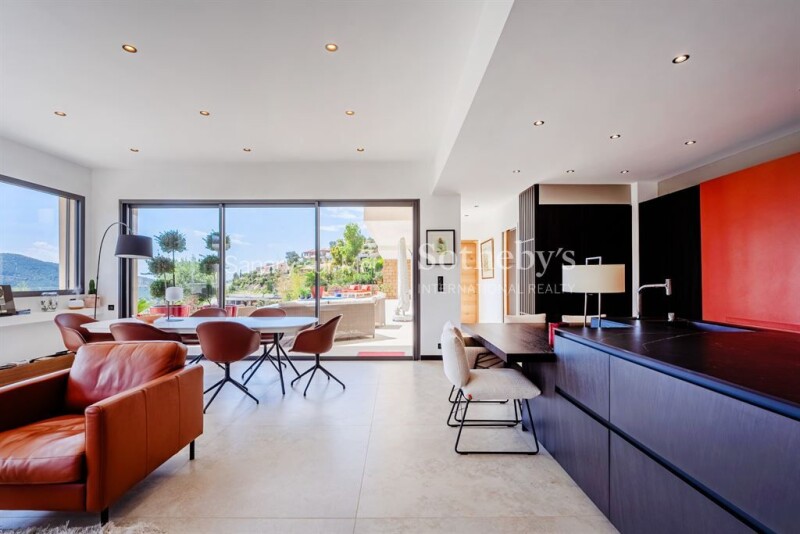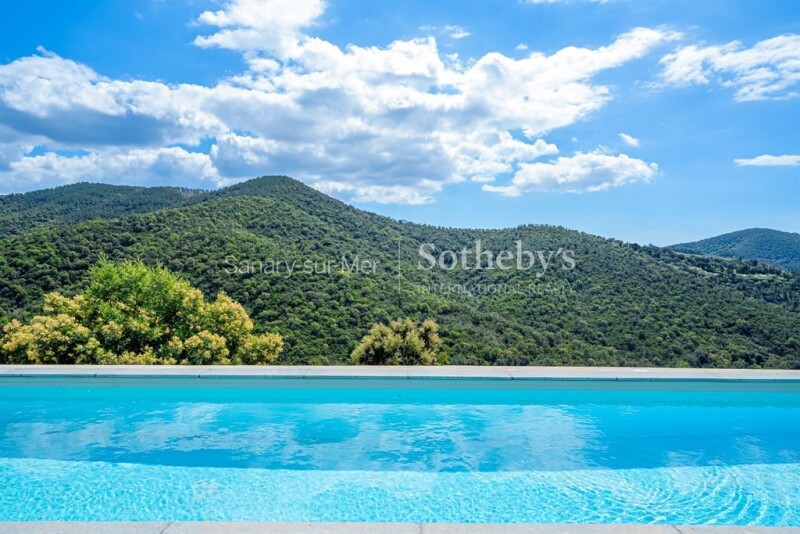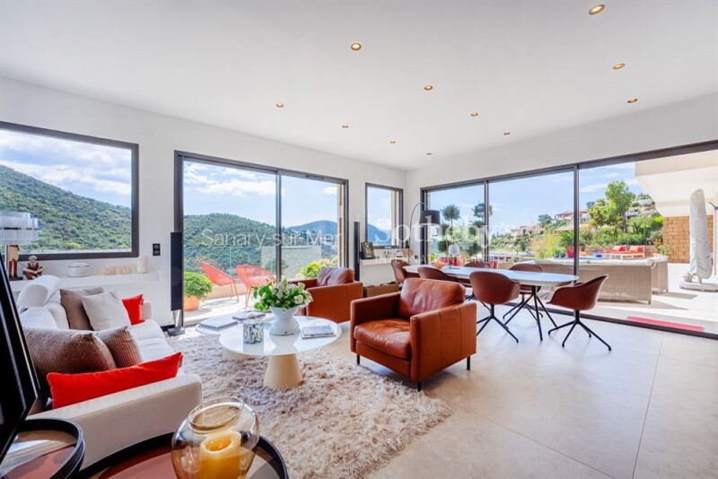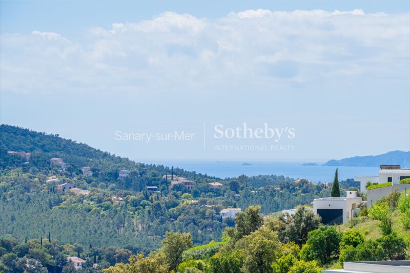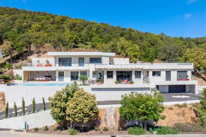 Contemporary villa for sale in La Londe-les-Maures with unobstructed views of the Valcros hills and a glimpse of the sea. Located in a private estate, this recent architect-designed villa boasts views of the sea, the island of Porquerolles, the hills, and the Valcros golf course. You will discover a luxurious interior of 183 sqm where every detail counts. The entrance leads to an open kitchen overlooking a spacious and bright living room from which you can access a large terrace bordering a pool and its sheltered dining area. An office and a suite extend the ground floor, while a beautiful master suite opens onto a terrace overlooking the pool. Upstairs, 2 suites with private terraces are oriented towards the golf and sea views. The villa has a double garage and several private parking spaces.