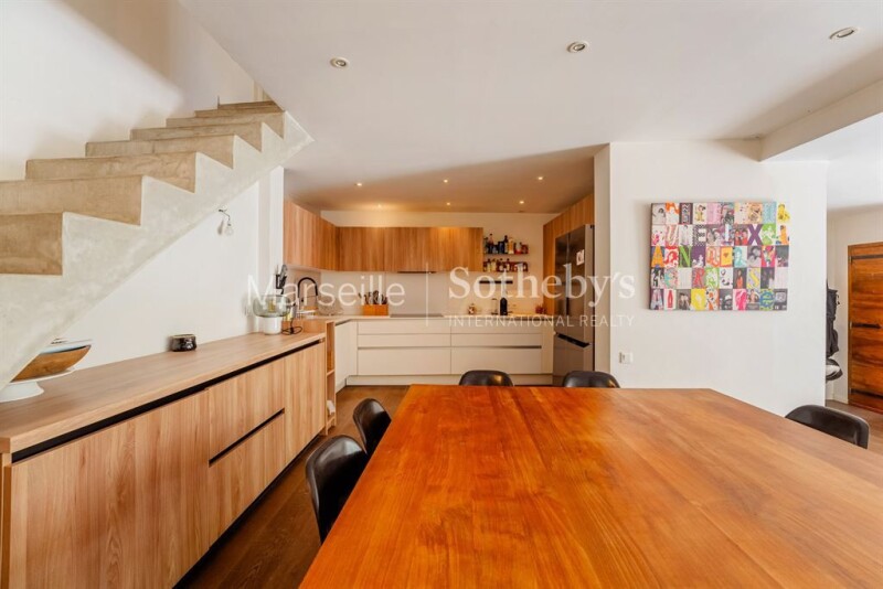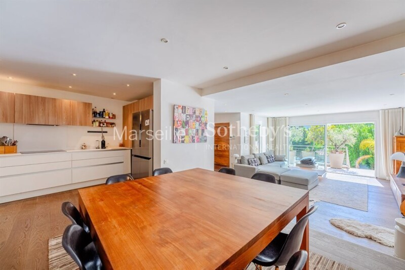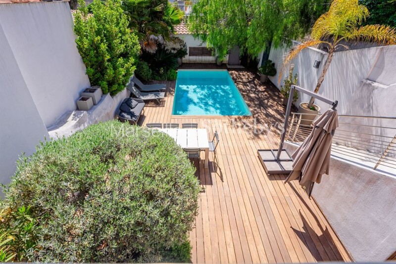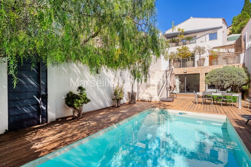 For sale in the 7th arrondissement of Marseille, in the heart of the prestigious Roucas Blanc neighborhood: a villa with a swimming pool, independent studio, and double garage. Located just a five-minute walk from the iconic Corniche with its breathtaking views, this property boasts an unparalleled location. Upon entry, this 155 sqm residence captivates with its elegance and high-end features. The ground floor houses a fully equipped independent studio, complete with a modern kitchen and bathroom, offering a perfect space for guests or private use. On the first floor, a spacious, light-filled living area consists of a lounge and dining room with an open-plan kitchen beautifully renovated with custom Italian furniture. This floor opens onto a large terrace equipped with a barbecue area, ideal for outdoor entertaining. The second floor features two bedrooms sharing a bathroom, as well as a master suite with an en-suite bathroom, walk-in closet, and private terrace. This fully air-conditioned villa ensures absolute comfort throughout the year. Every detail has been meticulously designed and executed with high-quality materials, combining aesthetics with functionality. The outdoor spaces include a swimming pool, perfect for soaking up the Mediterranean sun, and a garage accommodating three vehicles. Indulge in the privilege of living in an exclusive and unique setting, where every space reflects elegance and the Mediterranean art of living.