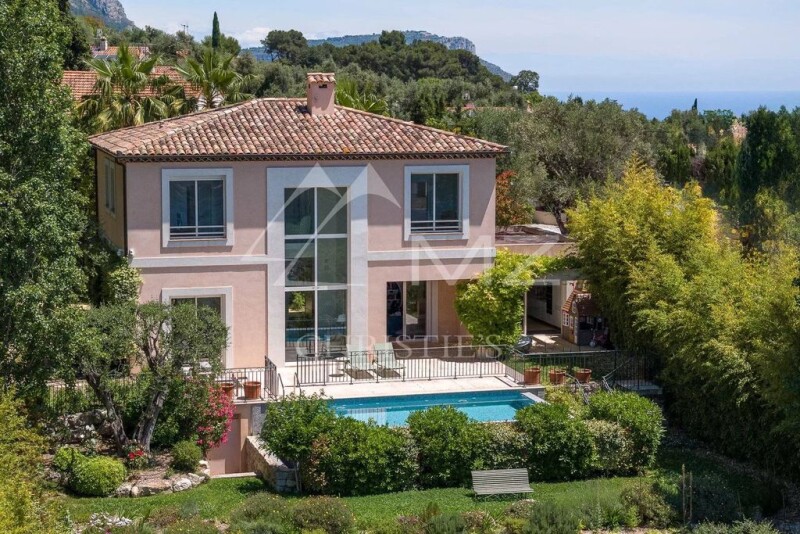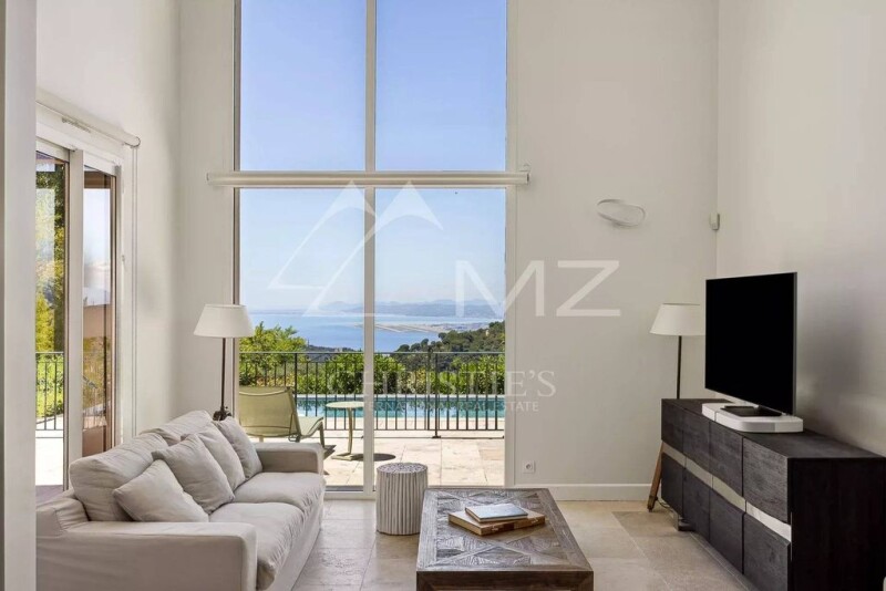 In a calm and picturesque environment offering a sea view on the Baie des Anges and Cap d'Antibes, a new and beautiful villa (interior surface of 215 sqm) with an infinity swimming pool, bay windows and marvellous garden. On 2 levels, it is composed from a spacious living room opening onto a terrace, dining room giving onto a second terrace, an equipped kitchen with laundry and 4 bedrooms with bathrooms/showers and an office. 2 car parking spaces (possibility for a closed garage).