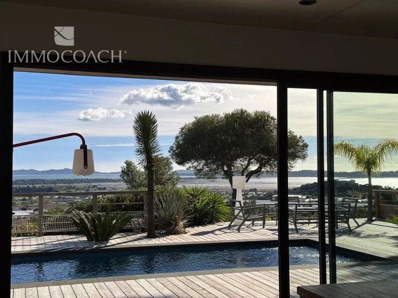 Located just minutes from the beaches and the center of Hyères, this exceptional villa of nearly 300 m² offers stunning views of Porquerolles Island and the Giens Peninsula. With its impressive volumes, bathed in natural light, it provides a truly unique living environment! Harmoniously renovated, this villa blends modernity, comfort, and elegance, featuring expansive terraces that invite relaxation. Large south-facing bay windows offer a spectacular panorama of the sea and lush greenery, erasing the boundaries between indoors and outdoors and filling every living space with unparalleled light. Boasting six bedrooms, each with its own private shower room, this villa offers the perfect setting for hosting family and friends in an atmosphere of intimacy and tranquility. The master suite includes an office, a shower room, a dressing room, a sitting area, and a private terrace, providing the owners with a refined and exclusive personal space. The spacious heated pool, complemented by a large wooden terrace, invites relaxation while offering an exceptional panoramic view of the sea and surrounding nature. Every detail has been carefully designed to create a peaceful and sophisticated ambiance. The generous basement includes a large garage, ample storage space, a workshop, and a large wine cellar. A rare property with numerous assets, not to be missed!.