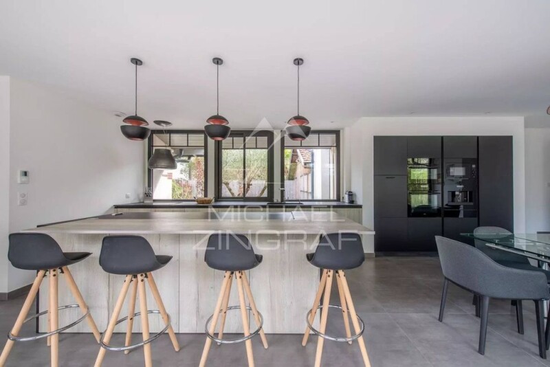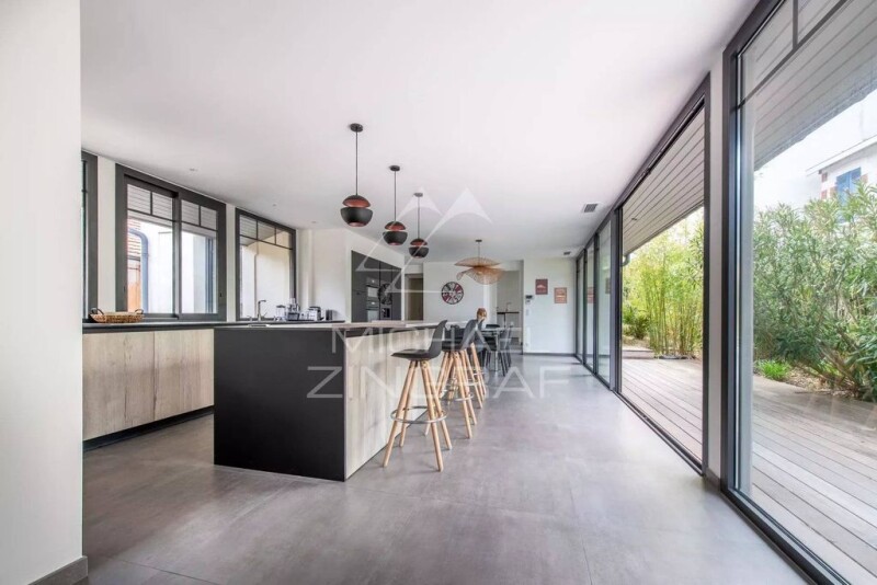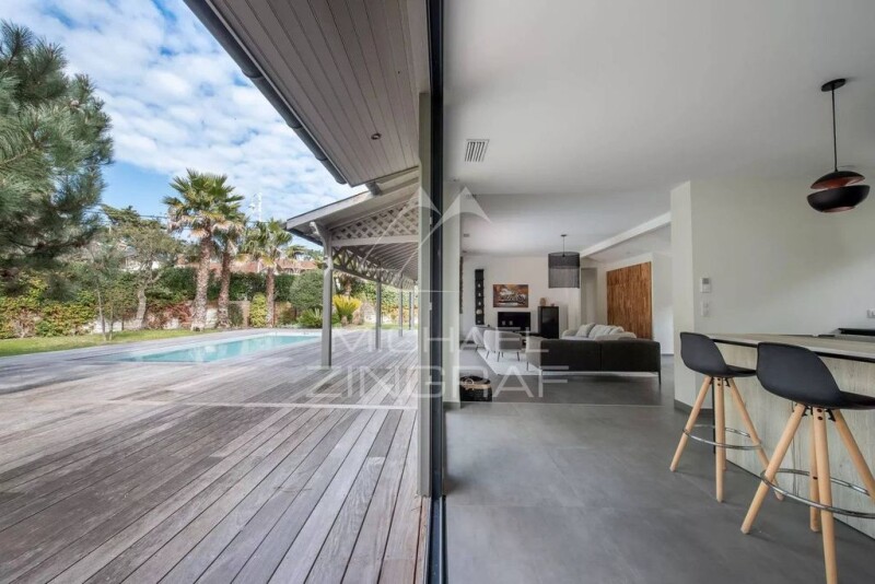 Michael Zingraf Bassin d’Arcachon presents this spacious and bright 190 m² house, ideally located in Le Moulleau, just steps from shops and the beach. Nestled on a plot of over 1000 m², it enjoys a privileged setting in one of the most sought-after neighborhoods of the Arcachon Bay. The main living area stands out with its generous spaces and through-layout, ensuring a seamless connection between indoors and outdoors. The large living and dining area extends through wide sliding glass doors onto the terrace, garden, and swimming pool. During summer, the garden naturally becomes an extension of the living space, offering an ideal setting to enjoy the mild climate and the unique atmosphere of Le Moulleau. The house includes two master suites, each with a private bathroom, as well as two additional well-appointed bedrooms, providing a comfortable living environment for family and guests. A garage completes the property, with the option to convert it into a large independent studio, which could accommodate one or two extra bedrooms depending on needs. This home’s layout, combined with its prime location, makes it a rare find on the market. Just a short walk from the beach and Le Moulleau’s vibrant shops and cafés, it offers an exceptional lifestyle, balancing liveliness and tranquility in the heart of the Arcachon Bay.