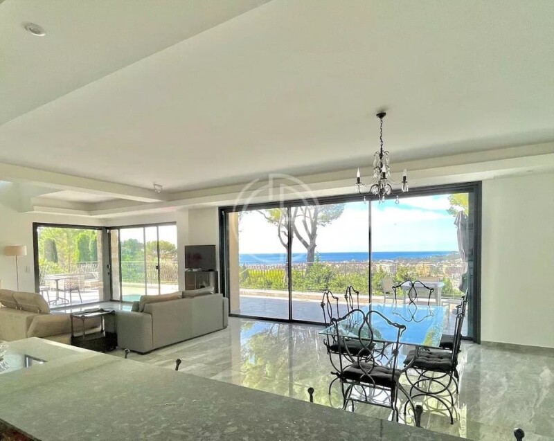 MOUGINS limite CANNES - On the heights of Cannes, Superb new contemporary villa offering a sea view overlooking the islands of Lerins up to the Esterel. This property of an exceptional area of 370m2 was designed to let in the light of all rooms and enjoy the view on the outside. Made by a renowned architect, You will appreciate the harmony of the stone building, details and high-end services. The entrance overlooks a large living room with high ceilings and large bay windows, equipped kitchen, master bedroom en suite, dressing room, another bedroom with its shower room and toilet. Upstairs, three other bedrooms all with their shower room and toilet, two large south facing terraces and sea view. On the ground floor, a summer kitchen, another bedroom and bathroom, hamman shower, cimama room. This part can be an independent apartment according to your needs. Wine cellar, hamman, jacuzzi, salt heated mirror pool with counter current swimming, toilet and outdoor shower. Alarm, home automation, watering, non-slip and heating floors of all bathrooms. ... Finally, the villa is entirely vegetated by fruit trees, olive trees, and Mediterranean essences. Possibility to add the court of 2133m2 a tennis court or padel. (estimate on request) Information on the risks to which this property is exposed is available at www.georisquess.gouv.fr.