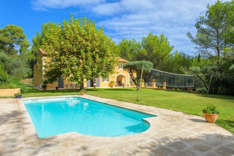Pretty family house of 360 m2 (270m2+100 m2) built in 1990 in the style of a Provencal bastide in Aix en Provence with beautiful materials, including Menerbes stone, wooden windows, hand-glazed terracotta floor tiles. Set in approx. 1 hectare of land decorated with a 10 x 4m swimming pool, plenty of trees and plants, in a haven of absolute peace in a remote neighbourhood. Beautiful entrance hall with high ceilings opens onto a lovely sitting room facing the south-facing terrace. Next to this is a dining room with a delightful stone fireplace. On the other side is a large, fully-equipped kitchen where you can enjoy your meals, as well as a working fireplace. A utility room and in the hallway a separate toilet, numerous cupboards, a laundry room and a large garage for 2 or 3 cars. 1 large bedroom and a small bedroom with a bathroom with bath, shower, bidet, WC and double washbasins. Upstairs, 5 bedrooms with a bathroom with bath and double washbasin shower. Separate WC. A dressing room that can be converted into a bathroom as all the water inlets are there. Numerous cupboards throughout. In the basement, a series of cellars, a recent 2-year-old oil-fired boiler room and 2 brand new water heaters. Finally, an apartment of approx. 100 m2 with a lounge, dining room and kitchen opening onto a south-facing terrace with a pergola. 2 east-facing bedrooms, a shower room and separate toilet. There is a separate entrance to this area. Contact us today to find out more.