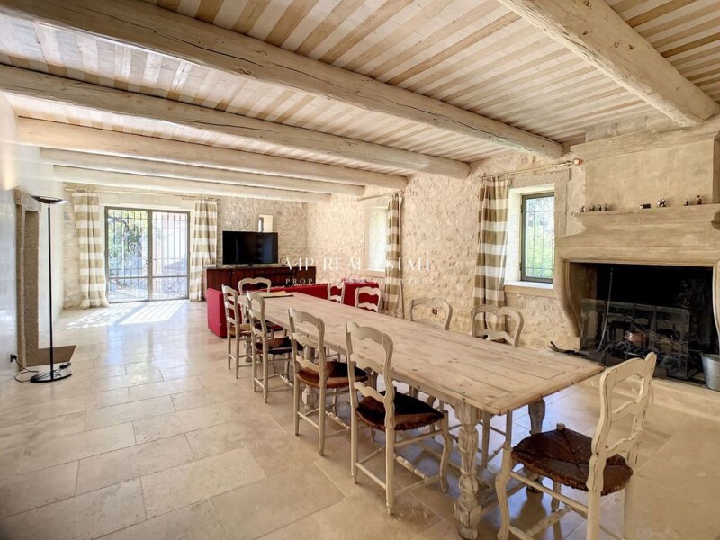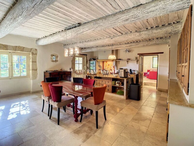 At the gates of the Luberon and close to L'Isle sur la Sorgue A beautiful century olive tree welcomes the visitors in the property. The atmosphere is given : old stones and wrought iron gates. The first gate walks you to the terrace opening onto the park with the pool and pool-house. The complete restoration has been made in respect of the place and highlighted the character of the building. The kitchen « Poivre d’Ane » designed, offers a very friendly space. The large living room of 60m2 will be a nice reception area. A second one, more intimate, is reserved for the piano or TV corner by the fireplace . Wine cellar, pantry, laundry and toilet complete the ground floor. At 1st floor, a comfortable owner suite of 60m 2, 3 rooms with their rooms of water, a study room ( or extra bedroom) and toilets. The Garden : the 1.1 ha welcome a closed park of 5000 m 2. The summer kitchen with pizza-oven and «plancha » are appreciated throughout the summer season. An independent room of 49m 2 hosts a 5 seats jacuzzi, a sauna and an additional room with shower. The colored concrete pool is extended by a terrace leading to the pool house with shower and toilets. You can produce your own olive oil thanks to the 40 olive trees planted and enjoy the different fruit trees of the property. Finally, for relaxation : a 'boules' lightened pitch for parties with friends and a, garage, a workshop, and technical room complete the estate. Isle-sur-la-Sorgue renowned for its numerous antique shops is 10 minutes away, Avignon TGV station 25 minutes and Marseille-International airport 40 minutes. Virtual visit and additional file on request.