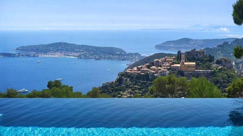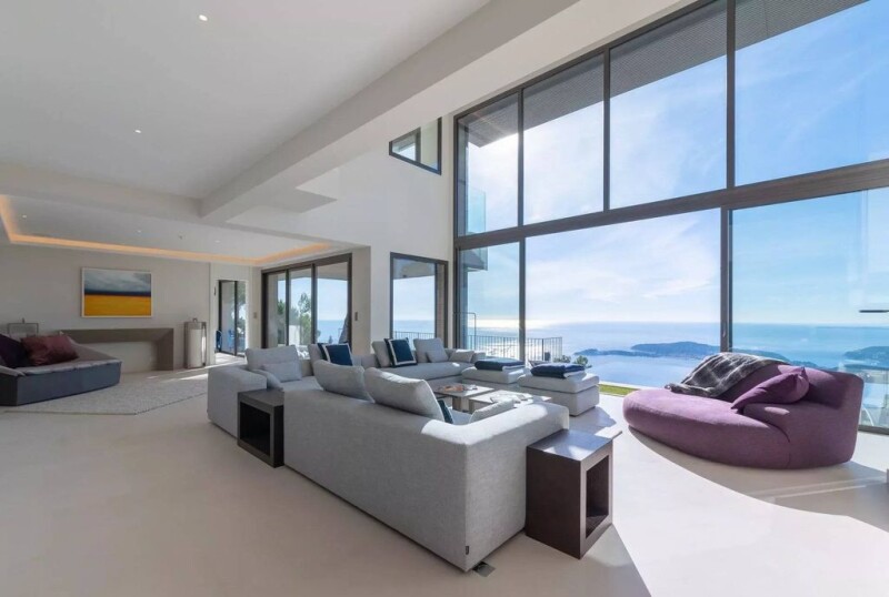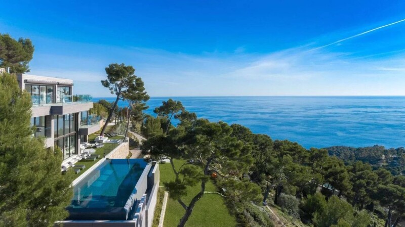 This new contemporary villa located on the heights of Eze provides a breathtaking panorama from sunrise to sunset, changing and enchanting landscapes. The villa with a total area of 472 m2 is built on a superb landscaped plot of approximately 12,590 m2. A beautiful infinity pool on the level of living area allows you to enjoy the view of the medieval village and the coast from Saint Jean Cap Ferrat to Cap Estérel. On the pool floor, a bright double living and dining room with large picture windows and a double height under ceiling, opens directly onto large terraces, the swimming pool, the jacuzzi and the magnificent garden. On the same floor you will find the open fitted kitchen and its separate service kitchen as well as a bedroom en suite. The main entrance is through the first floor which includes a master bedroom with dressing room and large bathroom as well as 3 bedrooms each with bathroom or shower. The second and last floor consists of a large bedroom with bathroom and a kitchenette, a gym and a small independent service apartment. This property offers luxurious services and an elevator serves all floors.