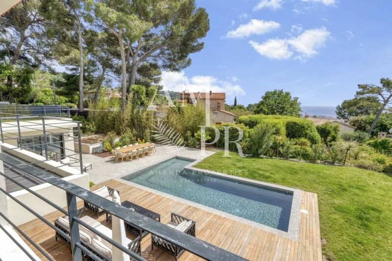 Beautiful, quiet house of 247 m2 with 6 rooms and a first floor, set in wooded grounds of 1,200 m2 with uninterrupted sea views from the terrace and first floor. The villa comprises a lovely, light-filled 70 m2 living room, 4 bedrooms and 4 bathrooms. A large terrace overlooks the swimming pool and wooded garden, and a roof terrace also offers a lovely sea view. The villa has been fully renovated to a very high standard, using top-quality materials and fittings. This villa is ideally located in the sought-after heights of Cannes. The property is sold with 1 closed garage of 26m2 and a courtyard for parking several vehicles, all secure.