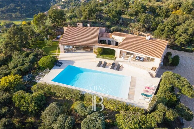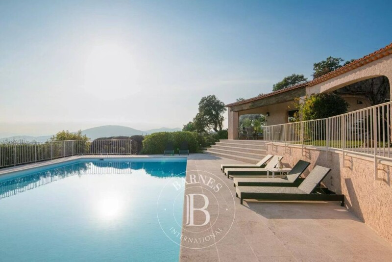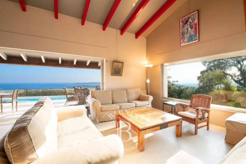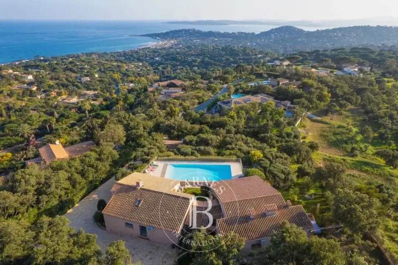 Situated in a dominant position on a prestigious estate in the commune of Sainte-Maxime, close to the Nartelle beaches, this single-storey Provencal house, with a floor area of 225 m², is built on a plot of 3,329 m². It enjoys panoramic views over the sea and the Gulf of Saint-Tropez, in a residential and leafy setting. It comprises an entrance hall, a large living room with high ceilings, an open-plan fitted kitchen, a storeroom, a utility room, four bedrooms, two shower rooms, two WCs, a garage and a workshop. The property also features a 35 m² detached guest house with living room, kitchenette, bedroom and shower room. Outside, a 15 x 6 m heated swimming pool and grounds of more than 3,300 m² provide a pleasant setting. A rare opportunity to enjoy the charm and comfort of the Côte d'Azur. ENERGY CLASS: D - CLIMATE CLASS: A/ Estimated annual energy costs for standard use: 2410€ - 3310€ - 2021 base year DPE new version Agency fees payable by vendor - Montant moyen de la quote-part de charges courantes 1,200 €/yearly.
