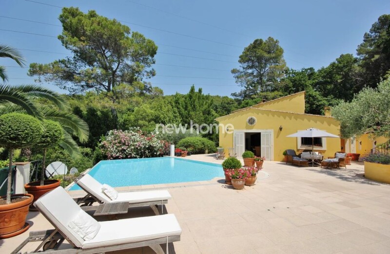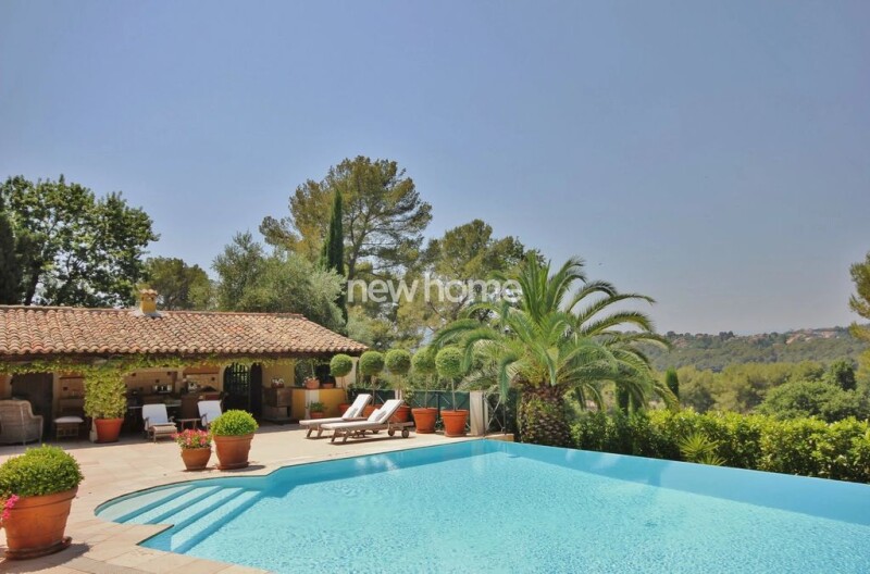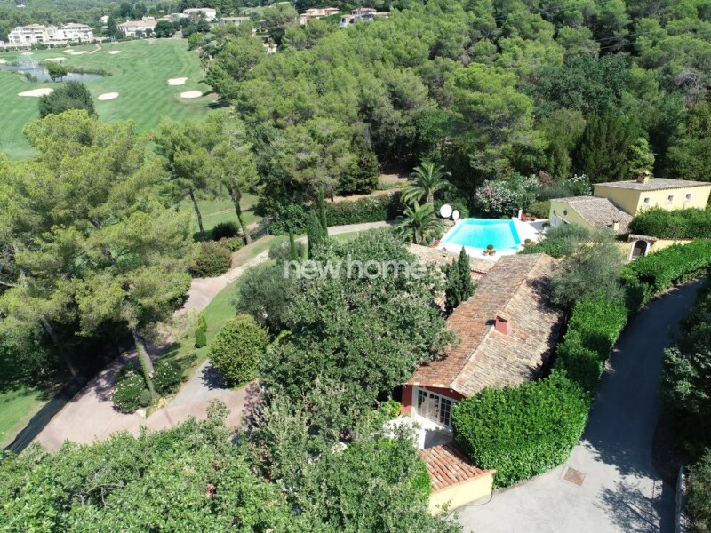Discover a hidden gem nestled in a secure domain of only four properties, offering unparalleled panoramic views of the Royal Mougins Golf Club and the picturesque hills. This private estate is situated on a sprawling, fenced plot of approximately 3.5 hectares.The main villa features a spacious living room with a cozy fireplace, an elegant dining room, and a fully equipped kitchen. It includes two guest rooms, each with their own ensuite bathrooms, and a luxurious master bedroom with an ensuite bathroom on the first floor. The floors are crafted from Provencal stone, adding a touch of regional elegance.The expansive terrace features a large swimming pool and a pool house complete with an equipped kitchen and BBQ area. Additionally, there is a dedicated office space of 30 m2, perfect for remote work or creative endeavors.The guest house, fully renovated in 2008, offers a charming living room with an open kitchen and two ensuite bedrooms. It also boasts a large terrace with breathtaking views of the golf course.For parking and storage, the property includes a carport accommodating two cars and a 60 m2 garage suitable for three cars. The estate's grounds are truly expansive, featuring a 13,665 m2 garden and a 22,316 m2 private forest with olive trees and ancient trees, perfect for serene nature walks.This unique property combines luxury living with natural beauty, making it an ideal retreat for those seeking privacy and elegance in a stunning location. Don't miss the opportunity to own this exquisite estate.