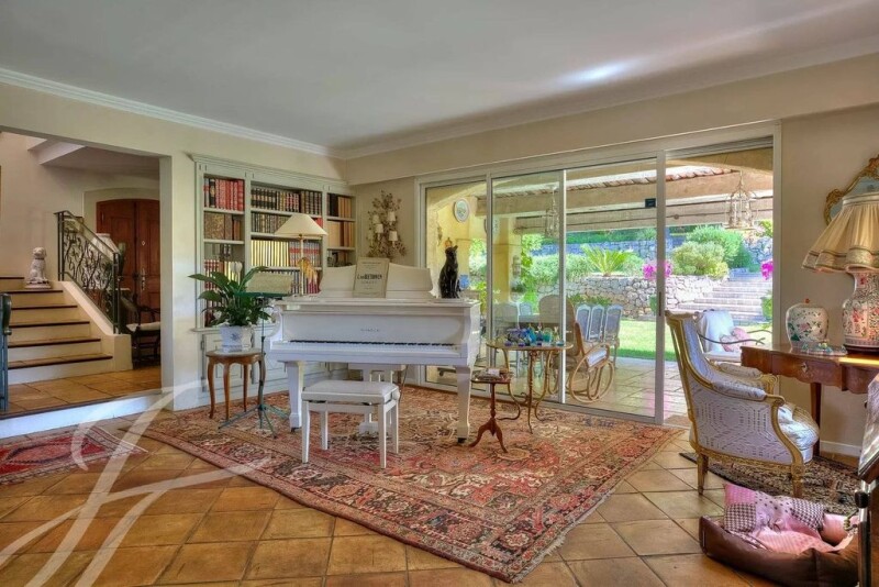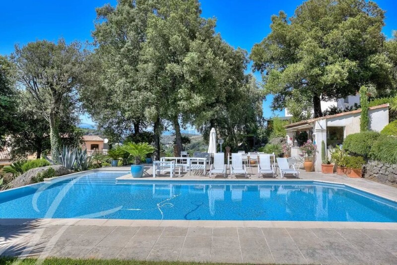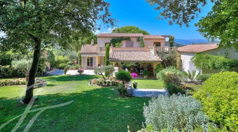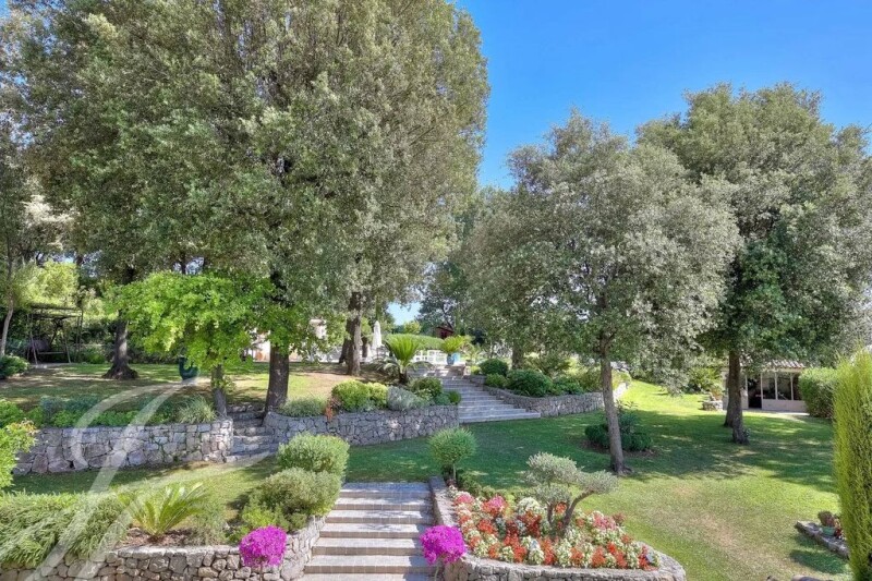 This charming family villa, perched in a dominant position, provides an idyllic setting for nature lovers while offering a convivial French lifestyle. With 260m2 of living space and its superb terraces, this property with its magnificent 2800m2 grounds adorned with Mediterranean trees, fruit trees and an infinite variety of plants, creates a warm and romantic atmosphere on different levels. The villa comprises a vast living room with fireplace and dining room, with large sliding doors opening onto the terraces. This large living room is complemented by an adjoining Provençal kitchen with a pantry and laundry room. A large en suite bedroom with shower room and pretty terrace has independent access, offering additional private space for guests or family members. Half a floor up you'll find a second bright en suite bedroom with shower room. The first floor is reserved for the master bedroom with en suite bathroom/shower opening onto a huge terrace with uninterrupted views over the magnificent garden, a true haven of peace for moments of relaxation in complete privacy. From the entrance hall you descend to a large studio with bathroom and terrace, which has independent access, providing additional versatility. The spacious basement houses a large games room that can also be used as a home cinema, a workshop and an exceptional air-conditioned wine cellar that will delight wine lovers. A double garage and numerous parking spaces complete the comfort of this attractive property, ideally located just 25 minutes from Nice airport and 5 km from the sea. État des risques et pollution: réalisé (2024-04-25).