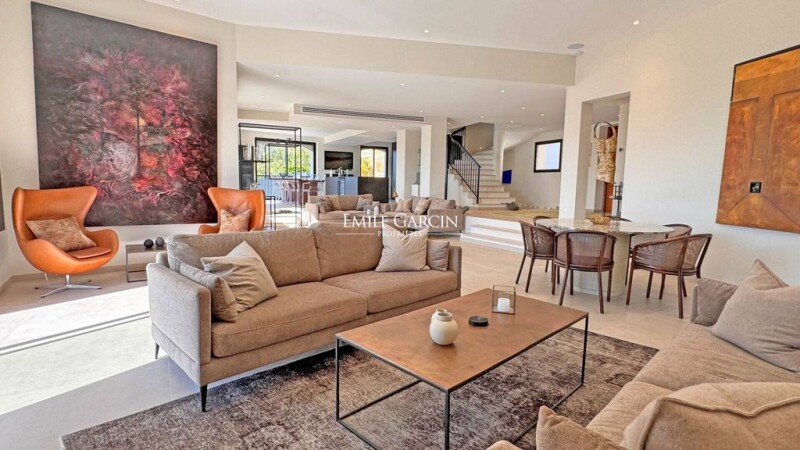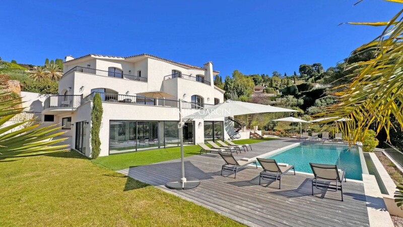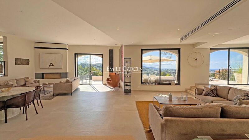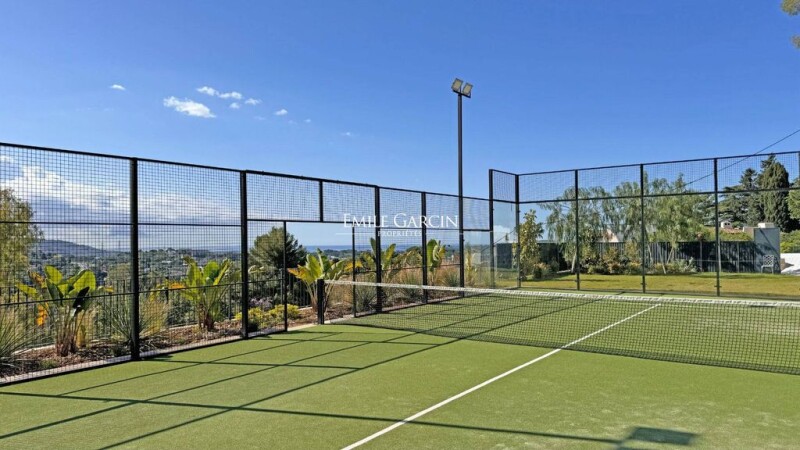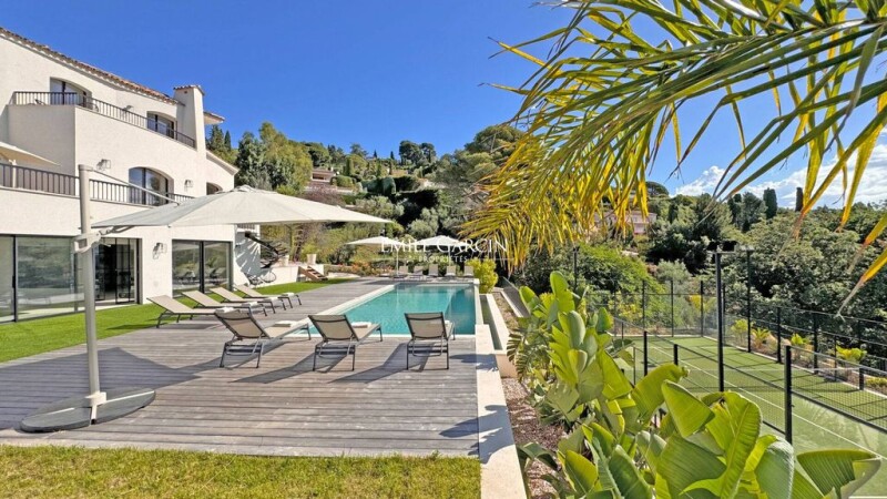 EXCEPTIONAL PROPERTY FOR SALE / MOUGINS / COTE D'AZUR / PANORAMIC VIEW OF THE SEA AND HILLS. Located in one of the most sought-after areas on the Côte d'Azur, just a few steps from the village of Mougins, this exclusive property presents breathtaking panoramic views of the sea and the surrounding hills. Idyllically located near the village of Mougins, renowned for its charm, Michelin-starred restaurants, art galleries and vibrant cultural life, the property is within easy reach of the beaches of the Côte d'Azur, Nice airport and many golf courses and other leisure facilities. Resolutely contemporary, the villa was completely renovated in 2024. It offers the perfect blend of luxury, comfort and modernity in an exceptional natural setting. This architectural gem combines an exceptional finish and a spacious interior. It is bathed in light and perfectly integrated into its natural surroundings. A perfect destination for anyone looking for comfort and high-end facilities, it is composed of two spacious living rooms with fireplaces, an independent TV lounge, an elegant dining room and a modern open kitchen. All the living spaces back onto a large terrace. The property boasts seven spacious bedrooms, each with its own bathroom, toilet and private terrace, making it ideal for hosting family and guests in the greatest comfort. It is equipped with an outdoor infinity pool with panoramic views, a heated indoor pool for optimal comfort all year round, a large gym, a sauna and a padel court. Its magnificent landscaped garden of approximately 2400 sq.m is a veritable oasis of calm surrounded by greenery.