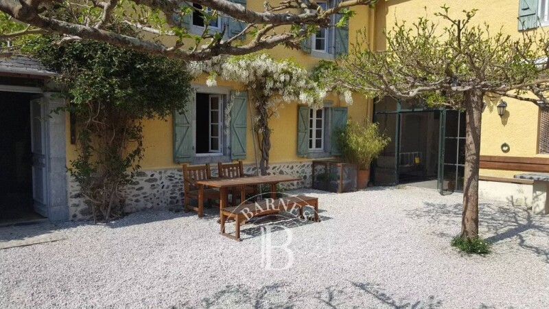 Former farm house and outbuildings dating from 1800 with approximately 450 m² of living space converted into B&B and set in 5 acres of land. The owner's area consists of 2 sitting rooms, a kitchen with a stove, 3 shower rooms and 2 WC. On the first floor, an office and 4 bedrooms; the guests wing has an independent access and includes 5 bedrooms and 5 shower rooms with wc, a large reception room (77 m²) and fireplace with a bar, a professional kitchen, laundry room and storage area. The whole property is in good condition with a natural slate roof, gaz central heating and solar panels to provide electricity. A large barn with 150m² ground space can be converted , chicken house and shelter for horses. Well maintained garden and grazing land for animals. A swimming -pool (10X5 m²)completes this peaceful property situated on the edge of a small village. Parking area and car ports. Oloron Ste Marie is 10 minutes and the ski resort of Pierre St Martin 30 minutes drive away. Spain 30 minutes drive. État des risques et pollution: réalisé (null).