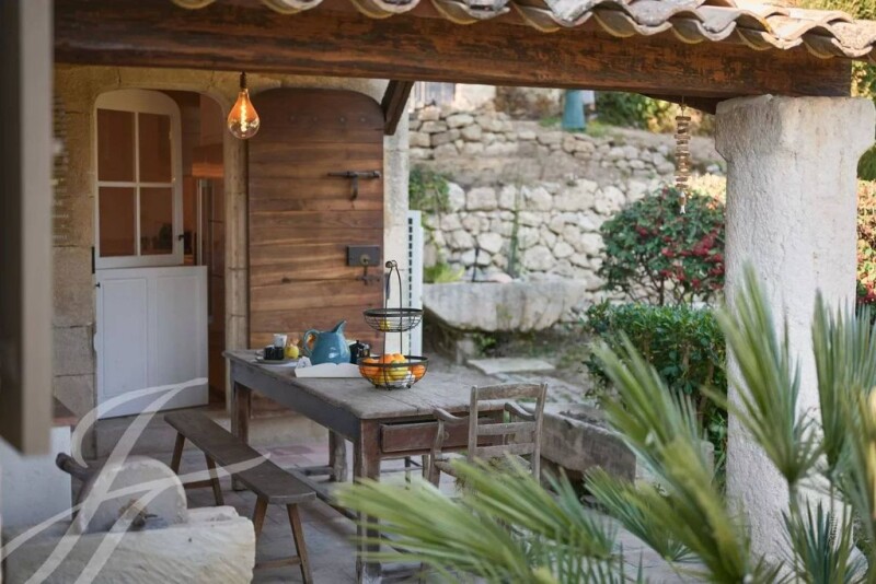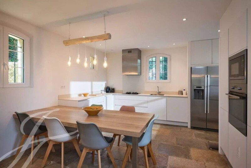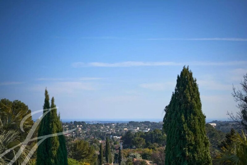 Very good opportunité : Located in one of the most beautiful areas of Mougins, close to shops and the old village, this large charming house of approximately 285 sq.m enjoys a panoramic view on the hills and the sea. Renovated in 2020, the house offers current interior services while having retained its original charm. It includes 1 en-suite bedroom on the ground floor, 3 bedrooms upstairs including a master suite extended by a charming terrace, as well as a comfortable studio on the garden level. The living rooms, bathed in light, benefit from a south-facing orientation and large spaces. Easy to live in, the property also offers an independent studio, a large swimming pool without any close neighbors, a locked garage for 2 cars, and numerous parking spaces.
