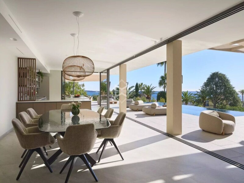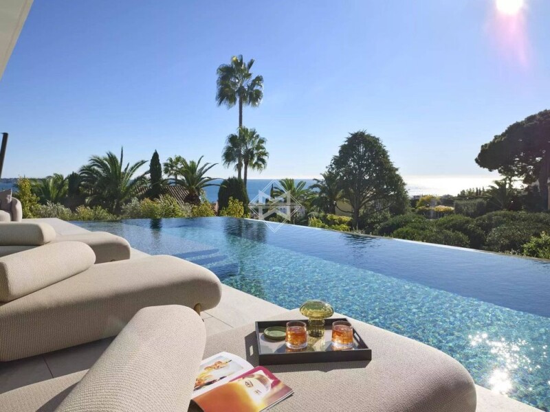 Located in an absolutely peaceful area in a residential neighborhood just 5 minutes from the beaches, this stunning newly-built contemporary villa of over 460 sqm offers a beautiful view of the sea and the famous Cap d'Antibes. Nestled at the heart of a plot of land of approximately 2,600 sqm, the villa, designed according to contemporary architectural principles, stands out with its generous volumes and numerous floor-to-ceiling windows that allow natural light to flow in, creating a seamless connection between the interior and exterior spaces. Comprising 5 en-suite bedrooms and a caretaker's house, the property offers a unique living experience with features such as an infinity heated mirror pool, a jacuzzi, an elevator, a billiard room with a wine cellar and bar, a cinema room, a gym with a sauna and hammam, a closed garage, numerous parking spaces, and a security system. The property also benefits from a pleasant covered lounge under a stylish pergola, as well as an outdoor dining area with a summer kitchen, perfect for barbecues with family and friends. Finally, the villa is ideally located just 5 minutes from the beaches and 15 minutes from the Croisette, while still offering absolute tranquility.