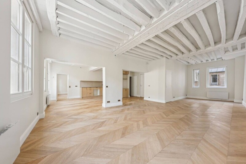 Paris 3rd - Temple Located in the historic Hostellerie de Sainte-Avoye, a mid-18th-century condominium, this 111.62 sqm (1,201 sqf) Loi Carrez apartment is situated on the second floor of a building without an elevator. Benefiting from a double east-west exposure, it enjoys views both onto the street and the courtyard. The 67.78 sqm (730 sqf) main living area features a spacious, light-filled layout with a through-living room and an open kitchen. The apartment includes a primary suite with a shower room, dressing area, and office space, as well as a second bathroom. A second bedroom can be created if needed. Fully renovated and in immaculate condition, this property is ideally located in the heart of Le Marais, near some of the most remarkable private mansions, including the Hôtel de Montmort, renowned for its majestic early 17th-century façade.