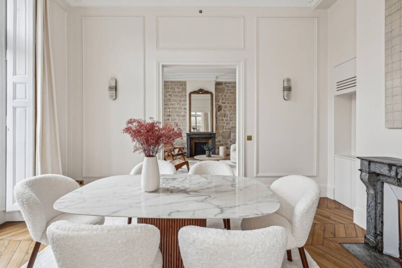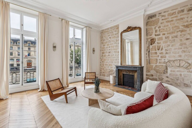 In the historic neighborhood of Notre-Dame Cathedral, within a beautiful late 18th-century building, on the noble floor. Ideal for a pied-à-terre, this property, completely renovated by an architect, boasts a surface area of 96 sqm (approx. 1,033 sqf) and will charm you with its spaciousness and its unobstructed views of the Seine and various iconic monuments of Île de la Cité. It comprises an entrance hall, a living room with exposed stone walls and original fireplace, a dining room, a fully equipped separate kitchen, a master suite, a bedroom, 2 bathrooms, and a guest toilet. With an impressive ceiling height of 3.60 meters (approx. 11.8 feet), the apartment is fully air-conditioned.