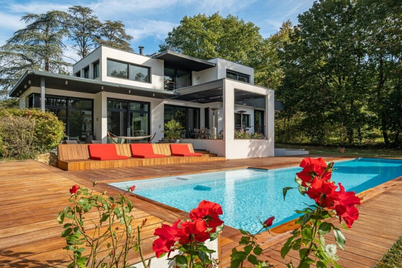 Situated in a sought-after area of Saint-Genis-Laval, this elegant property offers 475 sq. m. of sunny interior space opening on to multiple terraces and a large landscaped pool area with petanque court. The property is set in 4,500 sq. m. of landscaped grounds with trees. The house features a beautiful entrance hall, cathedral ceiling living room, dining room, fully equipped kitchen, four bedrooms (two en suite), study, laundry room and separate shower room. In the basement, you'll find a wellness area with gym, sauna, jacuzzi, billiards room and bar, a fully soundproofed music room and a splendid glazed wine cellar. Designed to be luminous, let yourself be seduced by its many glass walls, its peaceful and quiet environment and its privacy.