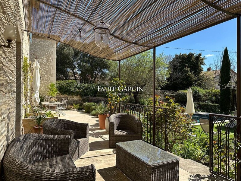 Beautiful townhouse for sale in the centre of Uzès. Presenting the perfect blend of period character and modern comfort, this secluded property stands out for its delightful outdoor spaces and its charming interior. It comprises a charming and exceptional house with a high-end finish, offering living spaces backing onto a shady terrace and garden. Upstairs, you will find three bedrooms (one of which is ensuite) plus an independent guest bedroom. At the bottom of the garden, there is a beautiful and comfortable workshop that could be converted into a dining area or additional bedroom. The magnificent garden is adorned with trees and equipped with a swimming pool. Additional facilities include a garage and a cellar.