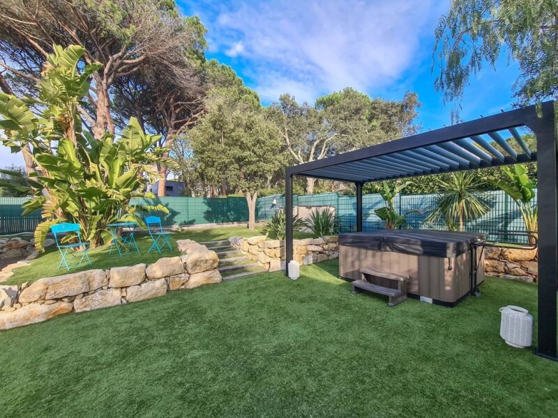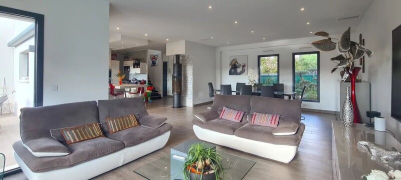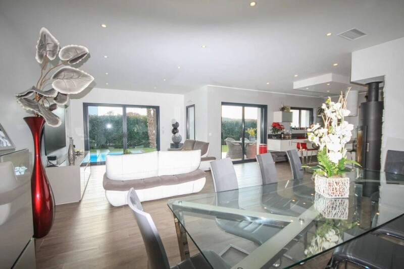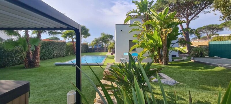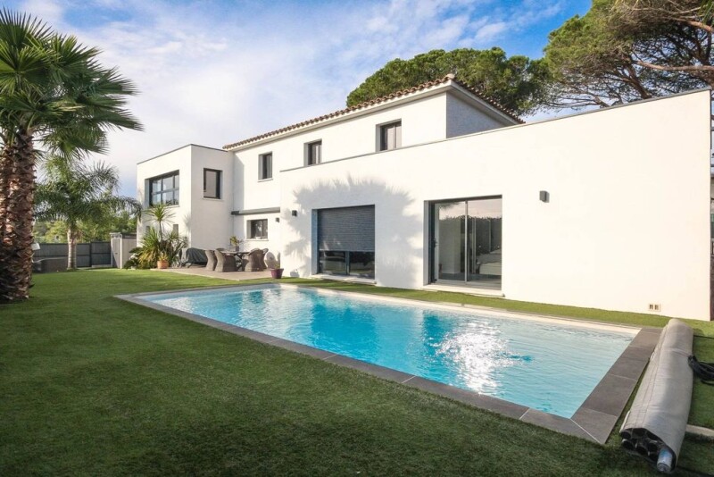 Located in a sought-after private domain, Valescure sector, this recent contemporary villa facing south, will seduce you with its bright and functional spaces, with modern comforts (sheathed air conditioning, centralized roller shutters, centralized aspiration, vmc, mixed pellet stove / wood etc) and automated. On one level, a living room of 60 m2 with open fitted kitchen opening onto a terrace bordering the swimming pool, master suite of 21 m2 with dressing room, and shower room - toilet, garage of 36 m2, laundry room. Upstairs, hallway with office space, 3 bedrooms with fitted wardrobes, two shower rooms, toilet. Games room of 32m2 (possibility of conversion into an independent studio or bedroom 5). Heated swimming pool, Jacuzzi, boules, flat, enclosed and fully landscaped garden of 822m2, where everything has been designed for easy maintenance. All quiet and not overlooked.