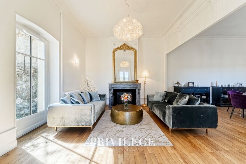 Discover this magnificent Master's property built in 1847, located in the sought-after town of Sainte-Colombe. Offering a rare and stunning view of the ancient theatre and Saint-Maurice Cathedral of Vienne, this residence of 190 m2 living space and approximately 250 m2 of usable surface has been carefully renovated while preserving distinctive elements of the Belle Époque such as generous ceiling heights, antique fireplaces, and solid wood and wrought iron staircases. The use of noble materials, such as oak parquet flooring and a walnut kitchen, give this property undeniable charm. Organized on three levels, this property comprises a basement with a boiler room and two large cellars, a ground floor with several enfilade living rooms and a separate kitchen opening onto a terrace of over 60 m2 offering a panoramic view of the city of Vienne, as well as a shower room and a separate toilet. The first level has a workspace, a bathroom with a bathtub, a toilet, and 4 beautiful bedrooms, including a 35 m2 master suite with its own fireplace. The second level offers a 90 m2 floor area (approximately 45 m2 of convertible attic space) allowing for the creation of additional bedrooms under the roof structure or any other recreational space. Located only 30 minutes from the city of Lyon, this property benefits from proximity to amenities such as schools, shops, and buses. It is also located in an NP zone, allowing for an extension and the creation of two accessory premises, a swimming pool, and the possibility of adding 30% of the floor area in an extension to the property. The landscaped and wooded park, with a surface of approximately 2975 m2, offers a peaceful and green living environment. Let yourself be seduced by the unique charm of this property combining the character of the old with modern and quality amenities.