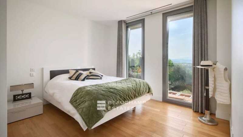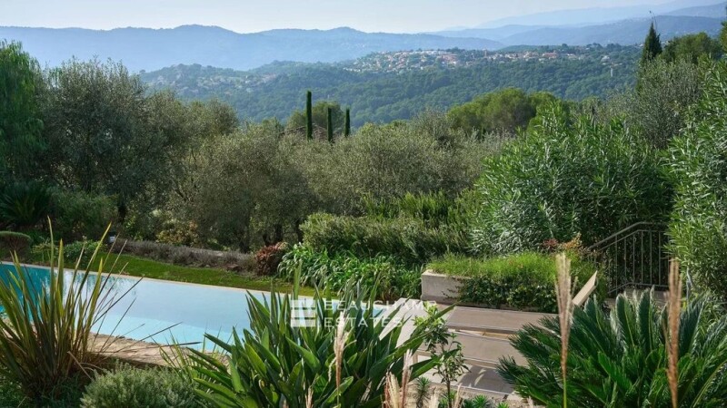 Set in a peaceful residential area of Mougins, this stunning contemporary property boasts panoramic views of the Grasse countryside, a west-facing orientation, and an exceptional setting on terraced grounds of approximately 4,000 m², featuring a harmoniously integrated pool and jacuzzi area. Main Level - A welcoming entrance - A spacious, light-filled living/dining room - A fully equipped independent kitchen - A vast terrace with stunning views over the pool area - A second large lounge, perfect for relaxing or hosting movie nights Garden Level - 5 en-suite bedrooms offering comfort and privacy - A charming library space for book enthusiasts - A large office, ideal for work or creativity - A generous walk-in closet - A laundry room and ample storage space Additional Features - A wine cellar - A garage accommodating multiple vehicles Energy class : C (102 kw) - Climat class : 5 (4kg)/ DPE old version. Information on the risk to which this property is exposed is available on the Geohazards website : www.georisques.gouv.fr.