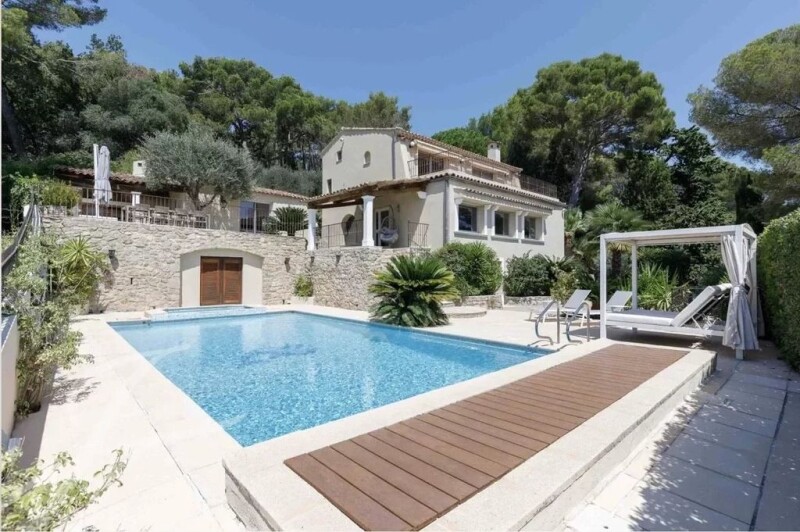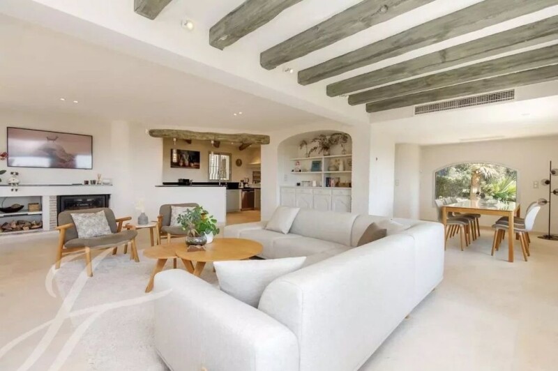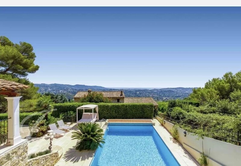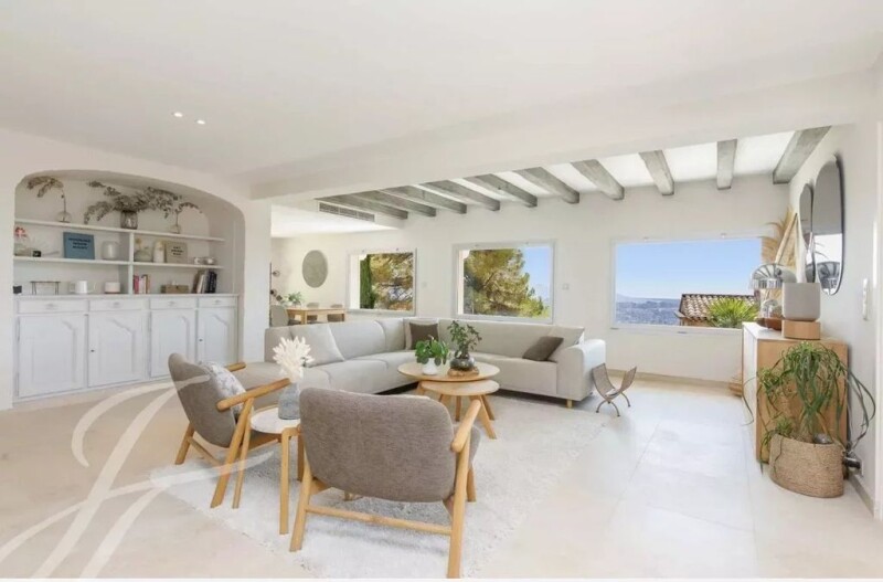 Mougins, in a sought after residential area, at the end of a peaceful cul-de-sac while close to all amenities, this magnificent, fully renovated villa enjoys uninterrupted panoramic views of the sea and Esterel's hills. On the first floor, accessed by an outside staircase, there is a large terrace with a fully equipped summer kitchen offering breathtaking panoramic views, as well as an independent bedroom with its own shower room/wc and dressing room. The entrance to the villa opens onto a beautiful living room with a fully fitted and equipped kitchen. This level also includes one en suite bedroom, a utility room and a guest toilet. Upstairs, another suite bedroom and the master bedroom with its dressing room and bathroom, both opening onto a lovely terrace with exceptional sea view. The 757 m² nicely planted plot of land is fully fenced, and features a swimming pool with integrated jacuzzi plus pool house with bread oven and barbecue. Wine cellar, large storage room, wood store and several parking spaces. This villa is a real "coup de coeur". État des risques et pollution: réalisé (null).
