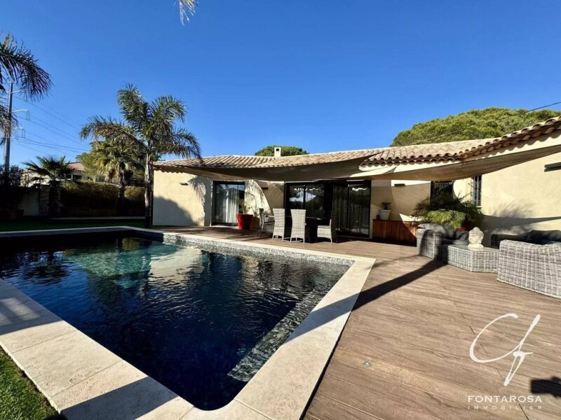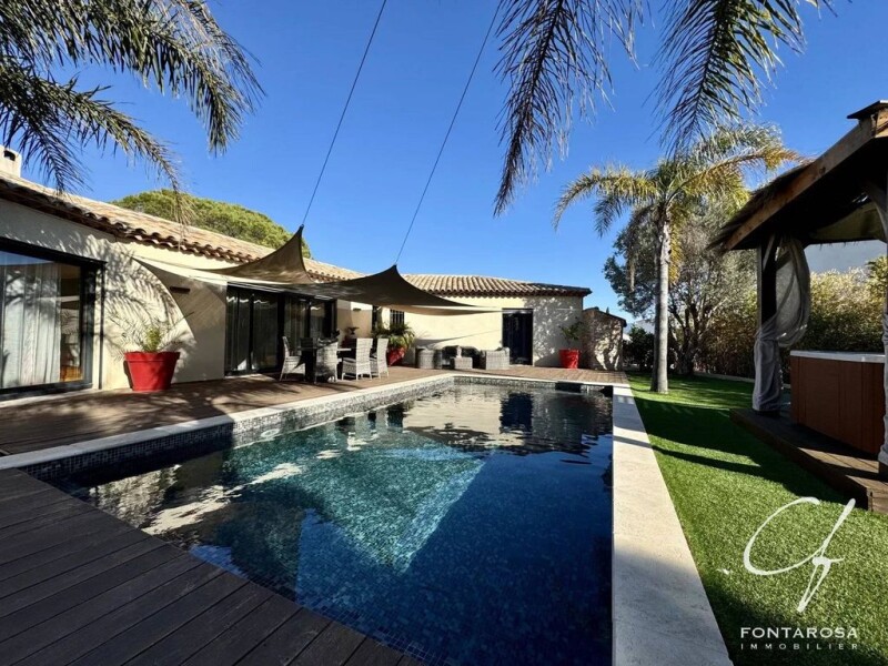 This exquisite villa in Puget-sur-Argens offers a perfect blend of modern luxury and traditional charm. Spanning 163 m², the property includes three bedrooms and six spacious rooms, all equipped with air-conditioning and double glazing. Enjoy the warmth of a cozy fireplace and the convenience of electric shutters and sliding windows, ensuring comfort and style throughout. The exterior is equally impressive with a beautiful swimming pool, jacuzzi, and a delightful boules court for your entertainment. The property also features a barbecue area, irrigation sprinkler, and outdoor lighting, making it ideal for alfresco dining and gatherings. A secure environment is provided with an alarm system, video security, and an electric gate, offering peace of mind and privacy. Additional amenities include a videophone, crawl space, and fast internet connectivity, ensuring all modern needs are met. With its fully landscaped gardens, this villa is a sanctuary of elegance and tranquility. Make this dream property your new home and experience refined living in the heart of France.
