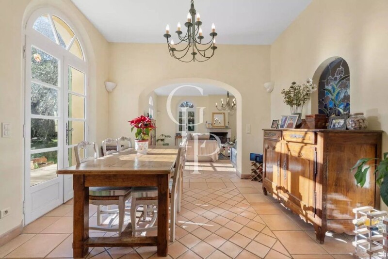 This beautiful villa, built in 2000, perfectly combines modern comfort with traditional elegance. Set on a flat plot of 2,400 sqm, within walking distance of the charming village of Valbonne, the property enjoys a lovely southern exposure and is surrounded by a peaceful environment with stunning olive trees. The spacious and welcoming entrance leads to a large, bright living room featuring a fireplace and large French doors that flood the space with natural light. The open-plan design of the living area includes a lounge, a dining room accessed through an archway, and a well-equipped kitchen. The ground floor also includes a study and a practical laundry room. Upstairs, you’ll find the master bedroom with an en-suite bathroom, one bedroom with a shower room, and two additional bedrooms sharing a shower room. Outside, the villa boasts a large covered terrace, a swimming pool surrounded by greenery, and several outdoor relaxation areas. Ideally located just 1 km from the village of Valbonne, this villa offers the perfect balance of tranquility and convenience, making it an ideal family home or a holiday retreat in Provence.