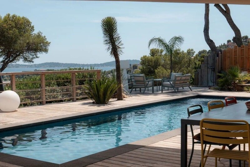 South-facing, exceptional property bathed in natural light thanks to its vast bay windows. Offering breathtaking views of the Mediterranean, it is ideally located in the immediate vicinity of the beaches, downtown Hyeres and the airport. Spread over two floors, the villa offers generous living spaces. The ground floor opens onto a wooden terrace with swimming pool. Inside, an open-plan kitchen is integrated into the living room, while two suites and a large bedroom with private terraces offer optimal comfort. The first floor houses a living room with another open kitchen, a suite with dressing room and two further bedrooms with en suite shower rooms. The upper floor is home to a sumptuous master suite and a rooftop that can accommodate a Jacuzzi. On the garden level, a double garage and a basement complete the property. Contact us today to find out more.