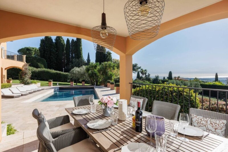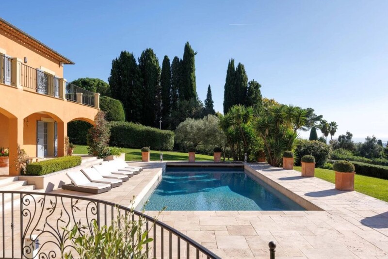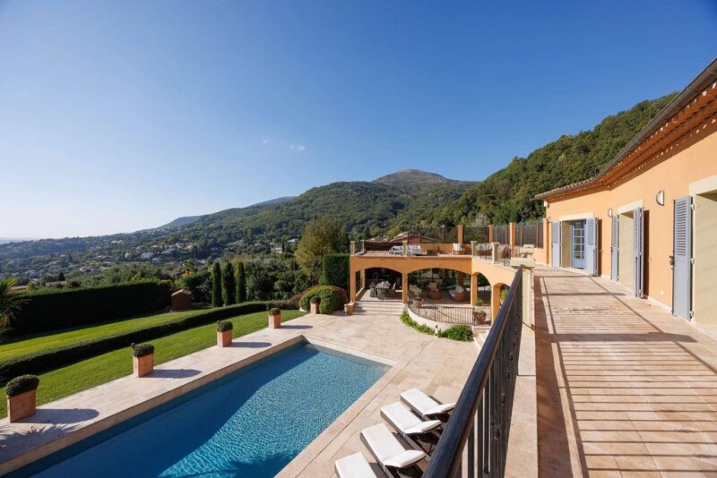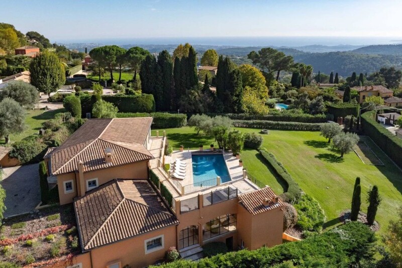 Situated in the residential heights of Vence, in the heart of a peaceful neighborhood at the end of a cul-de-sac, this exceptional estate boasts a rare combination of beautiful landscaped grounds of over 4,000 m2, with two unique, wide remaining plots, making the entire garden usable, and panoramic views all the way to the sea and the Esterel mountains. This elegant 430 m2 home with heated swimming pool embodies comfort and refinement. The wrought-iron gate opens and a paved path lined with greenery leads to the parking area and two-car carport at the rear of the house. The front door, protected by its porch, invites us to enter. From the entrance hall, the view of the sea and the generous volumes of the house are revealed. The spacious, light-filled double living room features a sitting room with fireplace, a reading room and a wine cellar. The dining room is adjacent to the kitchen, and has a very convivial layout. The vast kitchen with central island forms the heart of the villa, ideally situated between the interior reception rooms and the large, fully-covered summer living/dining room. Five magnificent suites, each with en-suite bathroom/shower and walk-in closet, offer all the comfort needed to welcome family and friends in an unforgettable setting. A gym completes this sumptuous villa. Cellar, laundry room, utility room. The well-maintained exteriors can be used all year round, thanks to the magnificent covered terrace with summer kitchen in front of the house. The huge flat garden area will delight the youngest visitors, making for endless playtime! A visit is a must!.