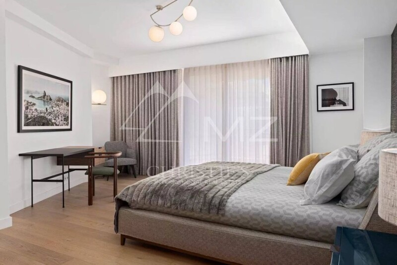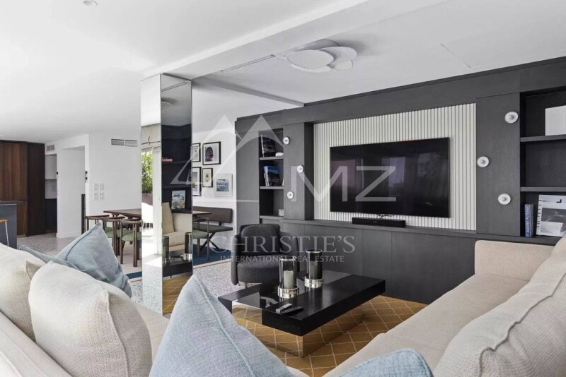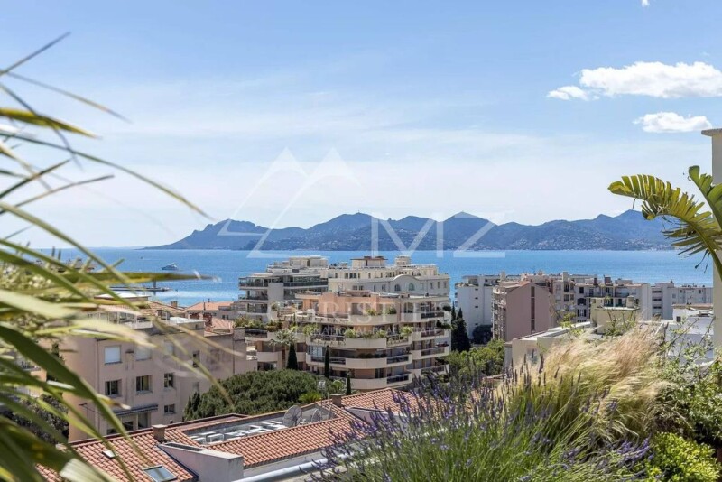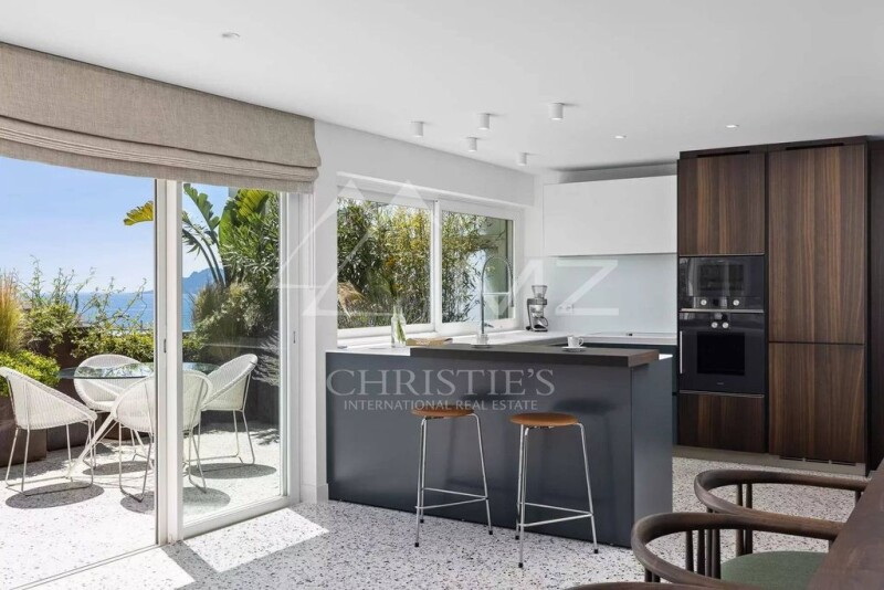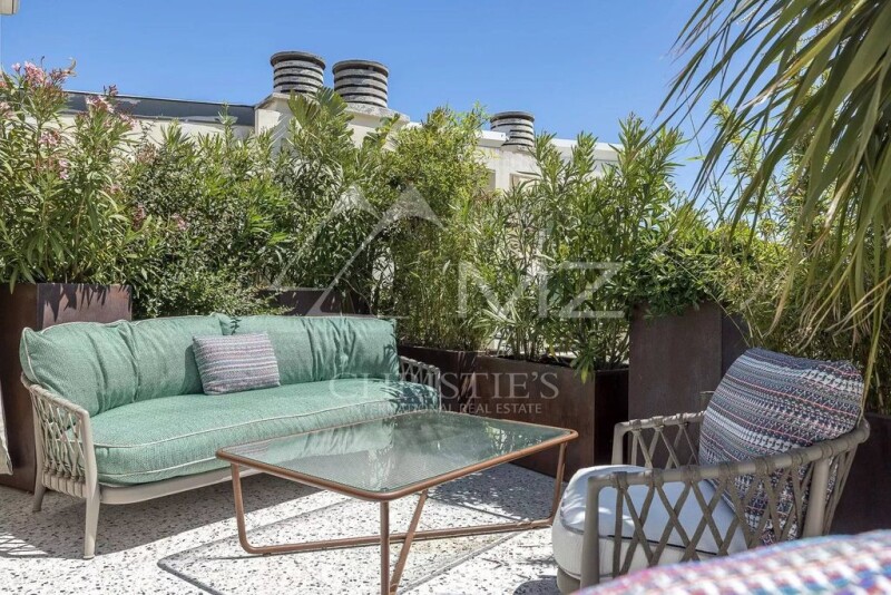 Exceptional 3-bedroom duplex penthouse with refined, high-quality materials. Everything is custom made. The Terrazzo staircase in the entrance hall takes you up to a spacious double living room and open Poliform fully fitted kitchen with "Gaggenau" integrated appliances and its laundry area. The living room and kitchen open onto a beautiful south-facing terrace of approximately 45m2 which lets you admire the Lérins Islands, l'Estérel and in the background the peninsula of St. Tropez. You will enjoy its views from sunrise to sunset, "seeing without being seen". The lower floor consists of a beautiful entrance which opens to the left onto a very spacious master bedroom of around 38m2 with a custom-made bed, sitting area, desk and Poliform closets. A large en-suite bathroom, equipped with double onyx vanity sinks and a custom-made American walnut cabinet, an Italian walk-in shower with wall cladding in marble and gold leaf in the shape of petals and Duravit freestanding bathtub. Separate toilets. Two large bedrooms with many custom-made Poliform closets and shower room with toilet. Shower wall covered with a hand-painted and custom-made feather-shaped siding. Last but not least: the property is located in a quiet street while being close to all commodities and beaches. A MUST SEE.