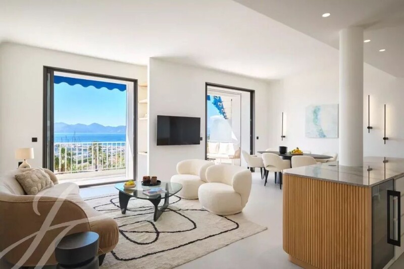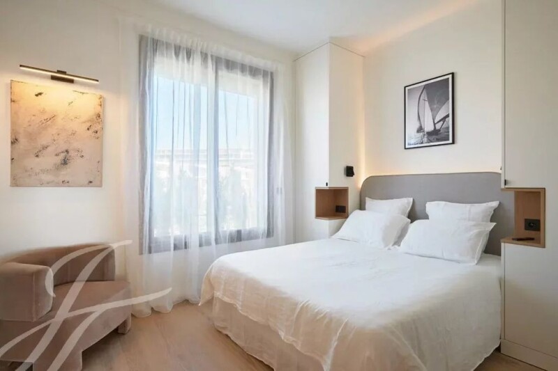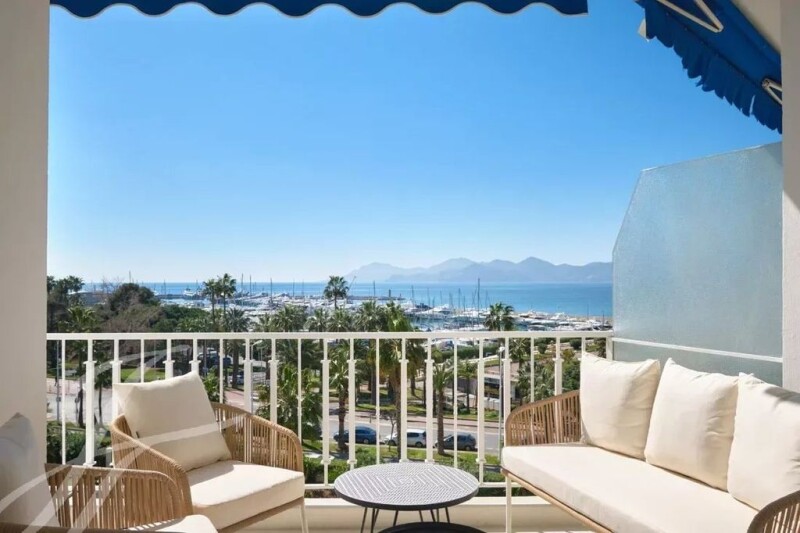 Facing the port and enjoying panoramic sea views over the bay of Cannes to the Estérel hills, this splendid flat offers 100 sq.m ideally appointed. Completely renovated in a refined contemporary style, it is composed as follows : - entrance hall, - living-dining room with open-plan kitchen opening onto a terrace, - 3 bedrooms with en suite shower rooms/toilets, - guest toilet. The residence with concierge service is set back slightly from the Croisette and has a beautiful garden.