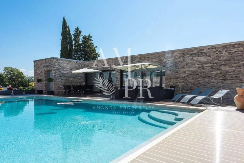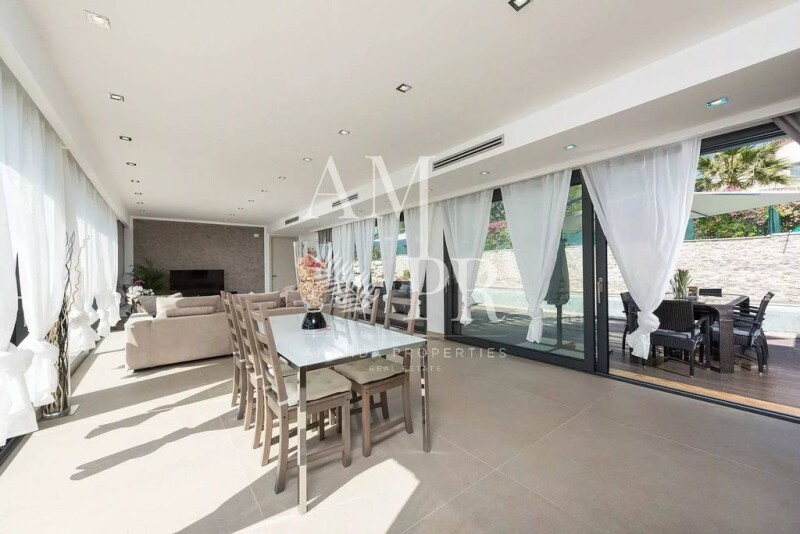 Amanda Properties proposes you splendid contemporary villa, about 290 m2 with refined services on a ground of 1261 m2, giving a clear view to the sea. 1 master bedroom and 3 en-suite bedrooms. Pool of 12x5.5 m heated, home automation, garage. Direct access to the sea, golf courses and shops, in a quiet area. 15 mn from the Croisette.