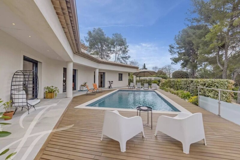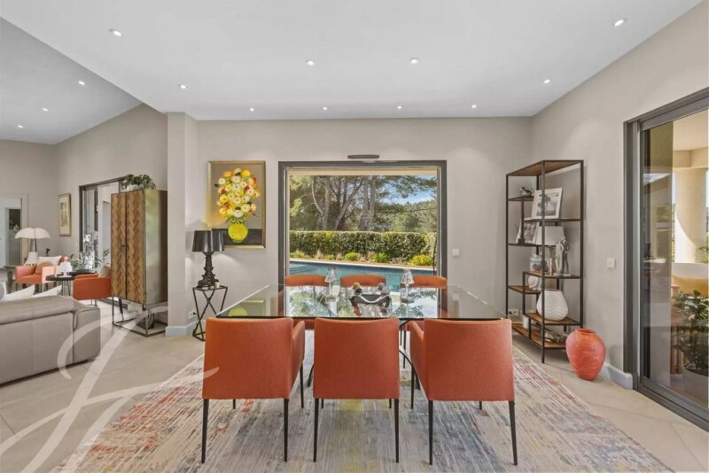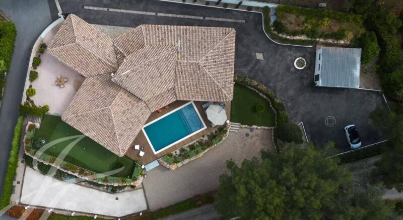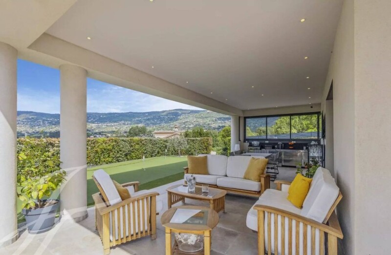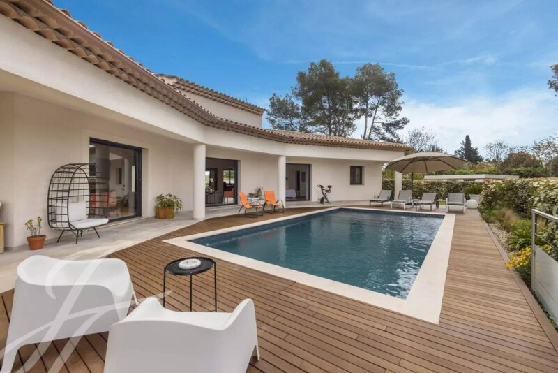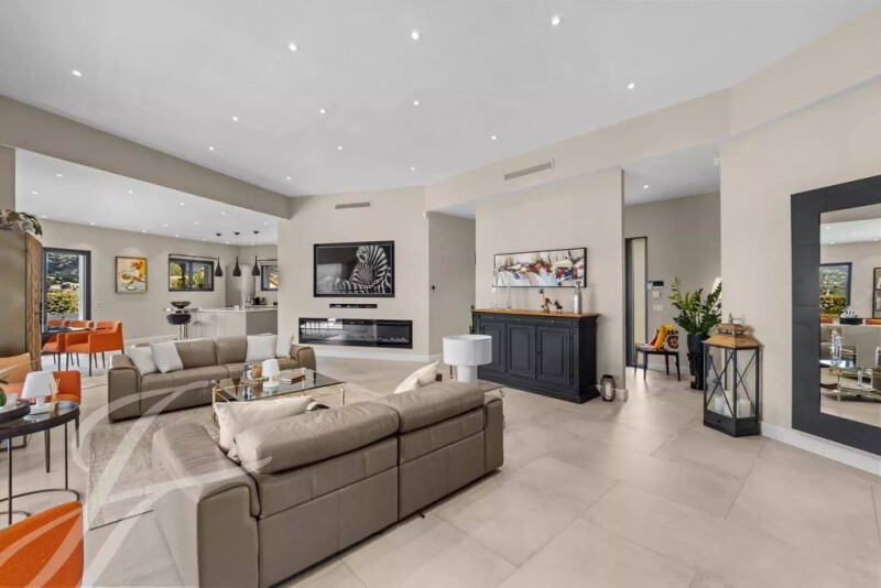 This contemporary single-storey villa with luxurious features, recently built, will grab your attention at first sight. It features a beautiful entrance, a spacious and luminous reception room opening onto a fully-equipped kitchen complemented by a rear kitchen, an office and three comfortable suites. Possibility 4th bedroom In addition, the property offers a superb summer kitchen with covered terrace opening onto an exceptional panoramic 180° view of the surrounding countryside. The property also boasts a swimming pool, ideal for sunbathing, a putting green, a cellar, numerous outside parking spaces as well as three garages. The flat, fully enclosed 2563 sq.m plot, superbly landscaped, is located at the end of a dead end street, offering absolute peace and quiet. Coup de coeur villa to be viewed asap.